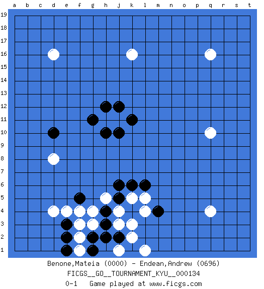 Last move : 0-1 2012 June 3 3:3:9 [Event "FICGS__GO__TOURNAMENT_KYU__000134"] [Site "FICGS"] [Date "2012.03.27"] [Round "1"] [Black "Benone,Mateia"] [White "Endean,Andrew"] [Result "0-1"] [Rating 1 "0000"] [Rating 2 "0696"] 1.j10 q16 2.k11 d16 3.h10 d4 4.g11 q4 5.h12 q10 6.d10 k16 7.k4 d8 8.j12 l4 9.m4 l5 10.l6 k5 11.j5 j4 12.h4 k3 13.k6 h5 14.j6 g4 15.h3 j3 16.j2 g3 17.h2 k2 18.k1 l1 19.g2 f2 20.e1 f1 21.g1 j1 22.e3 e4 23.e2 f3 24.f5 f4 0-1 This go game has been lost on time (started : 2012.03.27 21:59:54) Here are the names of the openings (joseki) played in the four corners : Corner d16 : d16 g11 Hoshi (Hwajeom, Seongjeom, Xingwei`) 4-4 Point. The star or hoshi (4-4) point, emphasizing influence at the potential expense of territory. Player White won this Go (weiqi, baduk) game. Follow this game move after move (download)Don't make dango's. (Anonymous) You cannot beat a roulette table unless you steal money from it. (Albert Einstein)