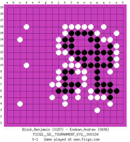 Last move : 0-1 2012 June 8 14:4:43 [Event "FICGS__GO__TOURNAMENT_KYU__000134"] [Site "FICGS"] [Date "2012.03.27"] [Round "1"] [Black "Block,Benjamin"] [White "Endean,Andrew"] [Result "0-1"] [Rating 1 "0187"] [Rating 2 "0696"] 1.r5 c4 2.r7 q16 3.o12 d16 4.p12 k4 5.q10 k10 6.q12 d10 7.l12 k16 8.m12 p3 9.p8 r14 10.r13 s13 11.r12 s15 12.n12 m10 13.m11 l11 14.n10 m9 15.n11 k12 16.o10 n9 17.p10 s12 18.p9 o5 19.m7 n7 20.l7 n8 21.k7 h7 22.k6 m6 23.l6 m5 24.j6 j7 25.k8 j8 26.q7 h5 27.p6 p5 28.q6 q5 29.r6 o6 30.p7 r4 31.s6 s11 32.r11 s10 33.r10 r9 34.p11 c14 35.k13 j12 36.l13 j13 37.k14 j14 38.l15 k15 39.l14 l16 40.m15 m16 41.o15 p15 42.n15 n16 43.o14 o16 44.p14 q14 45.p13 k5 46.k9 j9 47.l9 l10 0-1 Here are the names of the openings (joseki) played in the four corners : Corner q16 : q16 o12 Hoshi (Hwajeom, Seongjeom, Xingwei`) 4-4 Point. The star or hoshi (4-4) point, emphasizing influence at the potential expense of territory. Player White won this Go (weiqi, baduk) game. Follow this game move after move (download)Josekis are not fixed, definitive things. They indicate the moments when everything can change. (Pierre Audouard) There are three kinds of lies: lies, damned lies and statistics. (Mark Twain)