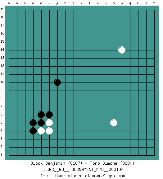 Last move : 1-0 2012 March 29 18:2:32 [Event "FICGS__GO__TOURNAMENT_KYU__000134"] [Site "FICGS"] [Date "2012.03.27"] [Round "1"] [Black "Block,Benjamin"] [White "Toro,Simone"] [Result "1-0"] [Rating 1 "0187"] [Rating 2 "0600"] 1.e5 p14 2.d4 e4 3.d5 f4 4.g10 o5 5.f6 f5 6.e6 1-0 Here are the names of the openings (joseki) played in the four corners : Player Black won this Go (weiqi, baduk) game. Follow this game move after move (download)Territory really exists only in the end. (Pierre Audouard) As a goal marker shodan is important. As a destination it is a poor place to stop. (Thomas Tamayo)