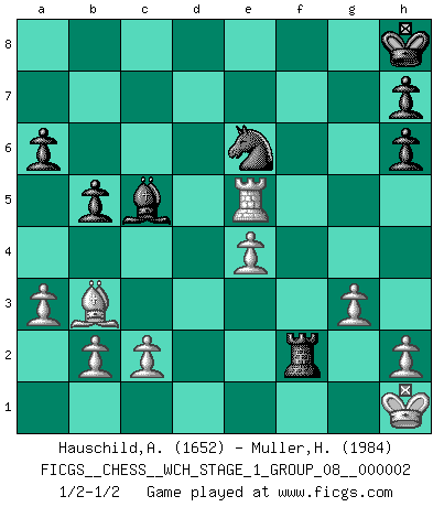 Last move : 1/2-1/2 2007 March 19 12:34:25 [Event "FICGS__CHESS__WCH_STAGE_1_GROUP_08__000002"] [Site "FICGS"] [Date "2007.01.16"] [Round "1"] [White "Hauschild,Achim"] [Black "Muller,Henri-Louis"] [Result "1/2-1/2"] [WhiteElo "1652"] [BlackElo "1984"] 1.e4 c5 2.Nf3 d6 3.d4 cxd4 4.Nxd4 Nf6 5.Nc3 a6 6.Bc4 e6 7.Bb3 b5 8.O-O Be7 9.Qf3 Qc7 10.Qg3 O-O 11.Bh6 Ne8 12.Rad1 Bd7 13.f4 Nc6 14.Nxc6 Bxc6 15.f5 Kh8 16.fxe6 gxh6 17.Rxf7 Rxf7 18.exf7 Ng7 19.Qf2 Rf8 20.a3 d5 21.Nxd5 Bxd5 22.Rxd5 Bd6 23.Qf6 Bc5+ 24.Kh1 Qxf7 25.Qxf7 Rxf7 26.g3 Rf1+ 27.Kg2 Rf2+ 28.Kh1 Ne6 29.Re5 Rf1+ 30.Kg2 Rf2+ 31.Kh1 Rf1+ 32.Kg2 Rf2+ 33.Kh1 1/2-1/2 Sicilian : Najdorf, Lipnitzky attack Kingside Castling by player White (move 8) Kingside Castling by player Black (move 10) This chess game ended in a draw. Follow this game move after move (download)The defensive power of a pinned piece is only imaginary. (Aaron Nimzovich) Ich bewundere Kasparows phantasievolle Angriffssiege aus den Achtzigern und Neunzigern, aber wenn man sie mit dem Computer überprüft, nimmt der Computer in jeder zweiten Partie die Opfer an, verteidigt sich und gewinnt. (Vladimir Kramnik) Un entendimiento a fondo de las continuaciones típicas del mate, hace de las combinaciones de sacrificio mas complicadas conducirlas a ellas no solo sin dificultad, sino casi de una manera natural. (Siegbert Tarrasch) Je ne suis pas le dernier à jouer lâchement des coups douteux pendant le zeïtnot de l'adversaire pour l'achever: en effet les coups qui font le plus peur sont ceux que l'on ne comprend pas. Je me fais souvent peur quand je joue. (Un professeur anonyme) Life is like a ten-speed bicycle: most of us have gears we never use. (Charles M. Schulz)