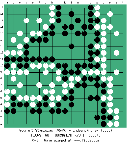 Last move : 0-1 2012 May 8 4:30:31 [Event "FICGS__GO__TOURNAMENT_KYU_I__000040"] [Site "FICGS"] [Date "2012.03.27"] [Round "1"] [Black "Gounant,Stanislas"] [White "Endean,Andrew"] [Result "0-1"] [Rating 1 "0640"] [Rating 2 "0696"] 1.c4 r16 2.q3 d17 3.d10 q10 4.n7 k4 5.h3 k6 6.k5 j5 7.l5 k7 8.j4 h4 9.j3 h6 10.g4 h5 11.l4 f5 12.g5 g6 13.f4 e5 14.f3 e4 15.e3 f7 16.k10 j9 17.j10 h10 18.h11 g10 19.g11 f10 20.f11 e10 21.e11 d9 22.c10 c9 23.k9 j8 24.k8 h7 25.l6 l7 26.m7 l8 27.m10 m8 28.n8 g9 29.m9 r5 30.o5 r7 31.p7 r3 32.q4 r4 33.q6 r6 34.r2 s2 35.p2 c5 36.k16 c15 37.f14 f17 38.o12 q12 39.p10 p11 40.o11 p9 41.o10 q8 42.q7 r8 43.p8 o9 44.o8 n9 45.n10 q9 46.p12 q11 47.d4 d5 48.b5 b6 49.b3 a5 50.b4 a4 51.a3 a6 52.l9 m16 53.p17 p16 54.o16 q17 55.p15 q16 56.o17 p18 57.o18 p19 58.o19 r18 59.n15 q15 60.p14 q14 61.l18 h17 62.k15 c13 63.d12 c12 64.c11 b10 65.b11 b8 66.a10 b9 67.h16 g16 68.g15 f15 69.g14 e15 70.e14 d14 71.d13 a9 72.a11 b12 73.j17 a12 74.d11 h18 75.j18 h19 76.j19 r1 77.q2 q5 78.p5 p13 79.o13 q13 80.q1 s1 81.l13 c7 82.h15 pass 83.k3 s9 84.m17 s15 85.l16 s3 86.m15 b14 87.n16 s12 88.pass pass 0-1 Here are the names of the openings (joseki) played in the four corners : Corner d16 : d17 h11 Komoku (Somok, Xiao~mu`) 3-4 Point. The komoku (3-4) point is the traditional corner enclosure move.. Corner q16 : r16 o12 Komoku (Somok, Xiao~mu`) 3-4 Point. The komoku (3-4) point is the traditional corner enclosure move.. Player White won this Go (weiqi, baduk) game. Follow this game move after move (download)Go is not a blocking game, it's a game of action. (Pierre Audouard) The Internet isn't free. It just has an economy that makes no sense to capitalism. (Brad Shapcott)