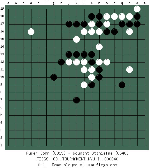 Last move : 0-1 2012 May 26 2:15:56 [Event "FICGS__GO__TOURNAMENT_KYU_I__000040"] [Site "FICGS"] [Date "2012.03.27"] [Round "1"] [Black "Ruder,John"] [White "Gounant,Stanislas"] [Result "0-1"] [Rating 1 "0919"] [Rating 2 "0640"] 1.n10 r16 2.k13 d16 3.g10 k15 4.k7 o12 5.q9 r11 6.p16 p18 7.q17 n14 8.n17 q18 9.r17 r18 10.s18 s19 11.s17 o18 12.n18 n16 13.o16 o17 14.l17 m16 15.j17 l16 16.k17 m17 17.m18 l11 18.m12 l12 19.l13 m11 20.n11 n12 21.m13 k12 22.j13 j12 23.h12 m10 24.m9 l9 0-1 This go game has been lost on time (started : 2012.03.27 22:3:10) Here are the names of the openings (joseki) played in the four corners : Corner d16 : d16 j17 Hoshi (Hwajeom, Seongjeom, Xingwei`) 4-4 Point. The star or hoshi (4-4) point, emphasizing influence at the potential expense of territory. Player White won this Go (weiqi, baduk) game. Follow this game move after move (download)If you cannot succeed, then die gloriously. (Chinese proverb) There are more things in heaven and earth than practically anywhere else. (Unknown)