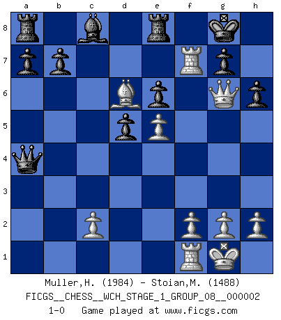 Last move : 1-0 2007 February 23 12:10:10 [Event "FICGS__CHESS__WCH_STAGE_1_GROUP_08__000002"] [Site "FICGS"] [Date "2007.01.16"] [Round "1"] [White "Muller,Henri-Louis"] [Black "Stoian,Mihail"] [Result "1-0"] [WhiteElo "1984"] [BlackElo "1488"] 1.e4 e6 2.d4 d5 3.Nc3 Bb4 4.e5 c5 5.a3 Bxc3+ 6.bxc3 Ne7 7.Qg4 O-O 8.Bd3 Nbc6 9.Qh5 Ng6 10.Nf3 Nce7 11.dxc5 Qa5 12.O-O Qxc5 13.a4 Qxc3 14.Bd2 Qc7 15.Bb4 Re8 16.Bd6 Qc3 17.Ng5 h6 18.Ra3 Qd4 19.Nxf7 Kxf7 20.Bxg6+ Nxg6 21.Rf3+ Kg8 22.Qxg6 Qxa4 23.Rf7 1-0 French : Winawer, Advance, poisoned pawn variation Kingside Castling by player Black (move 7) Kingside Castling by player White (move 12) Player White won this chess game. Follow this game move after move (download)Life is like a game of Chess, changing with each move. (Chinese proverb) Ich kenne Menschen, die allen Willen der Welt besitzen und doch nicht Schach spielen können. (Robert James Fischer) ¿Esta Bobby Fischer algo cuerdo?. (Salo Flohr) Les échecs sont un jeu terrible. Si vous n'avez pas le centre, votre adversaire a une position plus libre. Par contre, si vous avez le centre, alors vous avez vraiment quelque chose pour laquelle vous inquiéter ! (Siegbert Tarrasch) Wisdom is the reward you get for a lifetime of listening when you'd have preferred to talk. (Doug Larson)
