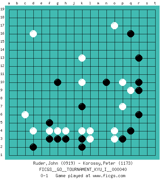 Last move : 0-1 2012 May 26 2:15:56 [Event "FICGS__GO__TOURNAMENT_KYU_I__000040"] [Site "FICGS"] [Date "2012.03.27"] [Round "1"] [Black "Ruder,John"] [White "Korossy,Peter"] [Result "0-1"] [Rating 1 "0919"] [Rating 2 "1173"] 1.n10 d4 2.g10 k10 3.k7 k13 4.f3 h4 5.f5 c6 6.d2 l4 7.k3 k4 8.h3 g4 9.g3 f4 10.q4 l3 11.k2 o3 12.p3 o4 13.r6 d16 14.q16 o17 15.r13 p10 16.r10 q9 17.r9 p7 0-1 This go game has been lost on time (started : 2012.03.27 22:3:10) Here are the names of the openings (joseki) played in the four corners : Corner d4 : d4 f3 Hoshi (Hwajeom, Seongjeom, Xingwei`) 4-4 Point. The star or hoshi (4-4) point, emphasizing influence at the potential expense of territory. Ikken Kakari (Hankan Keolch'im, Yi Gua`jiao~, 1-Space Low Approach). Black 2 is the standard approach move to the 4-4. Corner q4 : l4 q4 This joseki is unknown. A weak or weird move has probably been played in this corner. Corner q16 : q16 o17 Hoshi (Hwajeom, Seongjeom, Xingwei`) 4-4 Point. The star or hoshi (4-4) point, emphasizing influence at the potential expense of territory. Ikken Kakari (Hankan Keolch'im, Yi Gua`jiao~, 1-Space Low Approach). White 2 is the standard approach move to the 4-4. Player White won this Go (weiqi, baduk) game. Follow this game move after move (download)The second line is the line of defeat, the third line is the line of territory, and the fourth line is the line of influence. (Anonymous) Employ the attack like tactic of defense. (Chinese proverb)