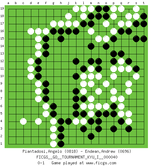 Last move : 0-1 2012 October 12 21:52:8 [Event "FICGS__GO__TOURNAMENT_KYU_I__000040"] [Site "FICGS"] [Date "2012.03.27"] [Round "1"] [Black "Piantadosi,Angelo"] [White "Endean,Andrew"] [Result "0-1"] [Rating 1 "0818"] [Rating 2 "0696"] 1.q16 c4 2.q4 d16 3.q10 k4 4.k16 d10 5.n3 h17 6.h15 f16 7.g16 g17 8.f15 e16 9.h16 j17 10.j16 k17 11.l17 e15 12.f14 e14 13.f13 e13 14.e12 d12 15.e11 d11 16.e10 e9 17.f9 e8 18.f8 e7 19.f7 f6 20.g6 f5 21.g5 g4 22.h4 g3 23.h3 g2 24.h2 g1 25.h1 e4 26.k18 j18 27.k6 m5 28.l5 l4 29.m4 l6 30.k5 m7 31.l7 m6 32.n5 l8 33.k7 n8 34.k8 l9 35.k12 m3 36.n4 l18 37.m18 k19 38.m17 n10 39.n12 p8 40.p9 o9 41.q8 p7 42.p6 o6 43.o5 n6 44.m10 l10 45.l11 m11 46.m12 m9 47.n11 m10 48.k10 p10 49.q9 p11 50.p13 q6 51.p5 q7 52.q11 q5 53.p3 r4 54.r3 r5 55.l3 r8 56.p12 r9 57.r10 s10 58.s11 q12 59.q13 r11 60.r12 q11 61.m2 r17 62.r16 q17 63.p17 s16 64.s15 t16 65.t15 s18 66.q18 r18 67.t18 p18 68.s17 q19 69.j4 m19 70.n19 l19 71.o18 s19 72.o19 p19 73.t17 o17 74.n18 p16 75.p15 o15 76.o14 n15 77.m14 m16 0-1 This go game has been lost on time (started : 2012.03.27 22:3:10) Here are the names of the openings (joseki) played in the four corners : Player White won this Go (weiqi, baduk) game. Follow this game move after move (download)Every move brings change. (Pierre Audouard) Opportunities multiply as they are seized. (Sun Tzu)
