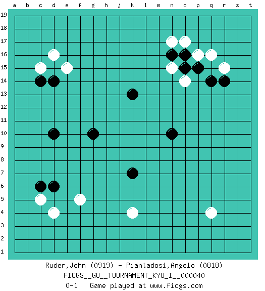 Last move : 0-1 2012 June 4 3:8:17 [Event "FICGS__GO__TOURNAMENT_KYU_I__000040 "] [Site "FICGS"] [Date "2012.03.27"] [Round "1"] [Black "Ruder,John "] [White "Piantadosi,Angelo "] [Result "0-1"] [Rating 1 "0919"] [Rating 2 "0818"] 1.n10 d4 2.g10 d16 3.k13 q16 4.k7 q4 5.c14 c15 6.d14 e15 7.d10 k4 8.c6 c5 9.d6 f5 10.r14 r15 11.q14 o14 12.p15 p16 13.o15 n15 14.o16 o17 15.n16 n17 0-1 This go game has been lost on time (started : 2012.03.27 22:3:10) Here are the names of the openings (joseki) played in the four corners : Corner d16 : d16 c14Hoshi (Hwajeom, Seongjeom, Xingwei`) 4-4 Point. The star or hoshi (4-4) point, emphasizing influence at the potential expense of territory.Ikken Kakari (Hankan Keolch'im, Yi Gua`jiao~, 1-Space Low Approach). Black 2 is the standard approach move to the 4-4. Corner d4 : d4 c6Hoshi (Hwajeom, Seongjeom, Xingwei`) 4-4 Point. The star or hoshi (4-4) point, emphasizing influence at the potential expense of territory.Ikken Kakari (Hankan Keolch'im, Yi Gua`jiao~, 1-Space Low Approach). Black 2 is the standard approach move to the 4-4. Corner q16 : q16 r14Hoshi (Hwajeom, Seongjeom, Xingwei`) 4-4 Point. The star or hoshi (4-4) point, emphasizing influence at the potential expense of territory.Ikken Kakari (Hankan Keolch'im, Yi Gua`jiao~, 1-Space Low Approach). Black 2 is the standard approach move to the 4-4. Corner q4 : q4 0-1Hoshi (Hwajeom, Seongjeom, Xingwei`) 4-4 Point. The star or hoshi (4-4) point, emphasizing influence at the potential expense of territory. Player White won this Go (weiqi, baduk) game.Follow this game move after move (download ) With less than 15 stones in danger, tenuki. (Anonymous) Now you put water in a cup, it becomes the cup; You put water into a bottle it becomes the bottle; You put it in a teapot it becomes the teapot. Water can flow or it can crash. Be water, my friend. (Bruce Lee)