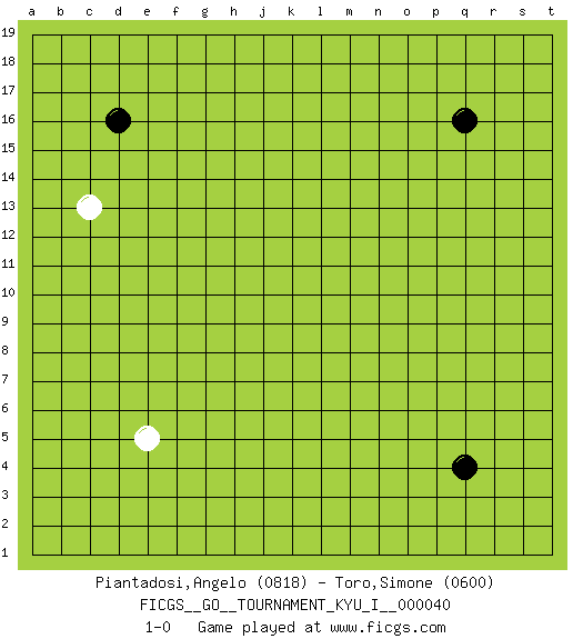 Last move : 1-0 2012 March 30 7:55:5 [Event "FICGS__GO__TOURNAMENT_KYU_I__000040"] [Site "FICGS"] [Date "2012.03.27"] [Round "1"] [Black "Piantadosi,Angelo"] [White "Toro,Simone"] [Result "1-0"] [Rating 1 "0818"] [Rating 2 "0600"] 1.q16 c13 2.q4 e5 3.d16 1-0 Here are the names of the openings (joseki) played in the four corners : Corner d16 : c13 d16 This joseki is unknown. A weak or weird move has probably been played in this corner. Player Black won this Go (weiqi, baduk) game. Follow this game move after move (download)To reduce an opponent's large prospective territory, strike at the shoulder. (Anonymous) In theory there is no difference between theory and practice. In practice there is. (Yogi Berra)