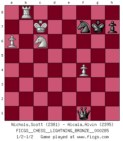 Last move : 1/2-1/2 2012 March 29 16:11:44 [Event "FICGS__CHESS__LIGHTNING_BRONZE__000285"] [Site "FICGS"] [Date "2012.03.29"] [Round "1"] [White "Nichols,Scott"] [Black "Alcala,Alvin"] [Result "1/2-1/2"] [WhiteElo "2381"] [BlackElo "2395"] 1.f4 d5 2.Nf3 g6 3.g3 Bg7 4.Bg2 Nf6 5.O-O O-O 6.d3 c5 7.Ne5 Nbd7 8.e4 dxe4 9.Nxd7 Bxd7 10.dxe4 Bc6 11.Qxd8 Raxd8 12.Nc3 Ng4 13.e5 Bxg2 14.Kxg2 f6 15.exf6 exf6 16.h3 Nh6 17.Be3 b6 18.Rad1 f5 19.Nb5 Bxb2 20.Rxd8 Rxd8 21.Rb1 Bd4 22.Bxd4 cxd4 23.Nxa7 d3 24.cxd3 Rxd3 25.a4 Ra3 26.Rb4 Ra2+ 27.Kf3 Ra3+ 28.Kf2 Ra2+ 29.Ke3 Ra3+ 30.Kd4 Nf7 31.Kd5 Rxg3 32.Kc6 g5 33.Kxb6 g4 34.hxg4 fxg4 35.a5 Rd3 36.a6 g3 37.Nc6 g2 38.Rb1 Rb3+ 39.Rxb3 g1Q+ 40.Kc7 Qf1 41.Rb8+ Kg7 1/2-1/2 Bird's Opening Kingside Castling by player White (move 5) Kingside Castling by player Black (move 5) 10 pieces endgame at move 34 : White KRNPP , Black KRNPP WHITE : King + 1 Rook 1 Knight 2 Pawns BLACK : King + 1 Rook 1 Knight 2 Pawns 9 pieces endgame at move 39 : White KRNPP , Black KNPP WHITE : King + 1 Rook 1 Knight 2 Pawns BLACK : King + 1 Knight 2 Pawns Promotion Queen by player Black (move 39) This chess game ended in a draw. Follow this game move after move (download)Examine moves that smite! A good eye for smites is far more important than a knowledge of strategical principles. (Purdy) Karpov ist ein Museumsstück. (Garry Kasparov) No nos podemos resistir a la fascinación de un sacrificio ya que la pasión por los sacrificios es parte de la naturaleza de un jugador de Ajedrez. (Rudolf Spielman) Karpov est une pièce de musée. (Garry Kasparov) Life is like internet, nothing interesting, but noone want to leave it. (Ilmars Cirulis)