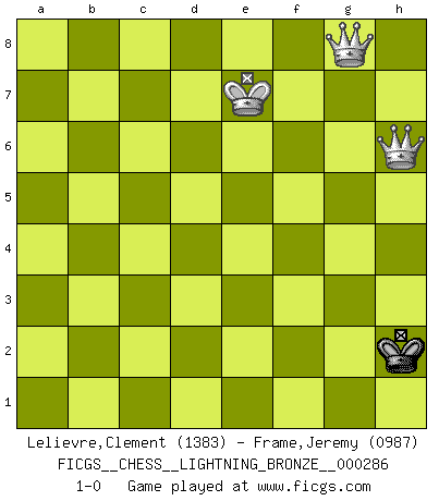 Last move : 1-0 2012 March 29 18:50:55 [Event "FICGS__CHESS__LIGHTNING_BRONZE__000286"] [Site "FICGS"] [Date "2012.03.29"] [Round "1"] [White "Lelievre,Clement"] [Black "Frame,Jeremy"] [Result "1-0"] [WhiteElo "1383"] [BlackElo "0987"] 1.e4 e5 2.Nf3 Nf6 3.Nxe5 d6 4.Nf3 Nxe4 5.Qe2 Qe7 6.d4 d5 7.Bg5 Nxg5 8.Nxg5 Qxe2+ 9.Bxe2 Be7 10.Nf3 O-O 11.Nc3 c6 12.O-O Bg4 13.Rae1 Nd7 14.h3 Bf5 15.Ba6 Rfe8 16.Bxb7 Rab8 17.Bxc6 Rxb2 18.Bxd7 Bxd7 19.Ne5 Be6 20.Re2 Bf6 21.Rfe1 Rc8 22.Nxd5 R8xc2 23.Nxf6+ gxf6 24.Rxc2 Rxc2 25.Ng4 f5 26.Nf6+ Kg7 27.Nh5+ Kh6 28.Nf6 Bxa2 29.Ra1 Rd2 30.d5 Bxd5 31.Nxd5 Rxd5 32.Rxa7 f6 33.f4 Kg6 34.Kf2 h5 35.Ra8 Rd3 36.Rg8+ Kh7 37.Re8 Rb3 38.h4 Rb4 39.Ke3 Kg7 40.g3 Rc4 41.Re7+ Kf8 42.Rh7 Kg8 43.Rxh5 Rc3+ 44.Kf2 Rc2+ 45.Kf3 Rc3+ 46.Kg2 Rc2+ 47.Kh3 Rc5 48.Kg2 Kg7 49.g4 Kg6 50.Rxf5 Rxf5 51.gxf5+ Kh5 52.Kg3 Kh6 53.Kg4 Kg7 54.Kh5 Kh7 55.Kg4 Kg7 56.h5 Kh7 57.Kh4 Kh6 58.Kg4 Kg7 59.Kf3 Kh6 60.Ke4 Kxh5 61.Kd5 Kh6 62.Ke6 Kg7 63.Ke7 Kg8 64.Kxf6 Kf8 65.Ke6 Ke8 66.f6 Kf8 67.f7 Kg7 68.Ke7 Kg6 69.f8Q Kh5 70.Qg8 Kh4 71.f5 Kh3 72.f6 Kh2 73.f7 Kh1 74.f8Q Kh2 75.Qh6+ 1-0 Petrov : Cozio (Lasker) attack Kingside Castling by player Black (move 10) Kingside Castling by player White (move 12) 10 pieces endgame at move 32 : White KRPPP , Black KRPPP WHITE : King + 1 Rook 3 Pawns BLACK : King + 1 Rook 3 Pawns 9 pieces endgame at move 43 : White KRPPP , Black KRPP WHITE : King + 1 Rook 3 Pawns BLACK : King + 1 Rook 2 Pawns 8 pieces endgame at move 50 : White KRPPP , Black KRP WHITE : King + 1 Rook 3 Pawns BLACK : King + 1 Rook 1 Pawn 7 pieces endgame at move 50 : White KPPP , Black KRP WHITE : King + 3 Pawns BLACK : King + 1 Rook 1 Pawn 6 pieces endgame at move 51 : White KPPP , Black KP WHITE : King + 3 Pawns BLACK : King + 1 Pawn 5 pieces endgame at move 60 : White KPP , Black KP WHITE : King + 2 Pawns BLACK : King + 1 Pawn 4 pieces endgame at move 64 : White KPP , Black K WHITE : King + 2 Pawns BLACK : King + Promotion Queen by player White (move 69) Promotion Queen by player White (move 74) Player White won this chess game. Follow this game move after move (download)Bobby is the most misunderstood, misquoted celebrity walking the face of this earth. (Yasser Seirawan) Ich hatte Angst gegen einen russischen Großmeister zu verlieren, und er befürchtete gegen einen kleinen Jungen zu verlieren. (über ein Remis gegen Juri Awerbach). (Robert James Fischer) El Ajedrez es el gimnasio de la mente. (Blaise Pascal) La vie et les Echecs sont tous les deux une lutte constante. (Lasker) God, you are such an idiot. - Actually, I thought I was more of a jerk. (Gregory House to Stacy Warner, House M.D.)