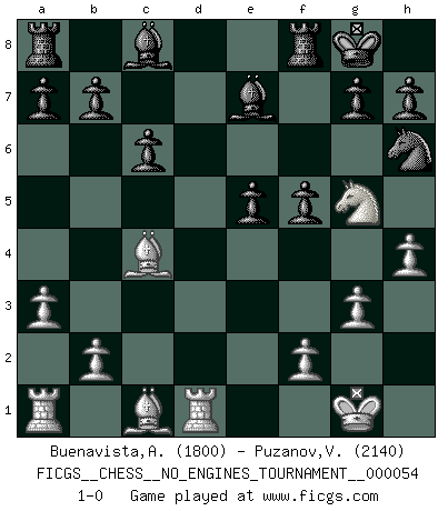 Last move : 1-0 2012 September 21 0:57:20 [Event "FICGS__CHESS__NO_ENGINES_TOURNAMENT__000054"] [Site "FICGS"] [Date "2012.03.30"] [Round "1"] [White "Buenavista,Anthony"] [Black "Puzanov,Vasyl"] [Result "1-0"] [WhiteElo "1800"] [BlackElo "2140"] 1.e4 d5 2.Nf3 dxe4 3.Ng5 f5 4.Bc4 Nh6 5.d3 Nc6 6.a3 exd3 7.O-O dxc2 8.Qxc2 Nd4 9.Qd3 Qd6 10.g3 e6 11.Nc3 e5 12.Nb5 Nxb5 13.Bxb5+ c6 14.Rd1 Qxd3 15.Bxd3 Be7 16.h4 O-O 17.Bc4+ 1-0 This chess game has been lost on time (started : 2012.03.30 17:8:50) Scandinavian (centre counter) defense Kingside Castling by player White (move 7) Kingside Castling by player Black (move 16) Player White won this chess game. Follow this game move after move (download)The tactician knows what to do when there is something to do; whereas the strategian knows what to do when there is nothing to do. (Gerald Abrahams) Das Schachspiel übertrifft alle anderen Spiele so weit wie der Chimborasso einen Misthaufen. (Arthur Schopenhauer) Con el tiempo, empecé a progresar en partidas decisivas. Tal vez porque me di cuenta de una simple verdad: no solo estaba yo nervioso sino también mi oponente. (Mikhail Tal) Lorsque vous vous retrouvez devant une position atroce, ne tendez pas un ultime piège dérisoire avec l'intention d'abandonner si l'adversaire le déjoue ! Faites-vous plutôt un devoir de résister comme si votre vie en dépendait. Jouez le coup qui vous déplairait au centuple si vous étiez dans la peau de votre tortionnaire ! Luck is when opportunity knocks and you answer. (Anonymous)