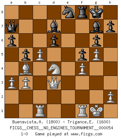 Last move : 1-0 2012 May 25 8:52:34 [Event "FICGS__CHESS__NO_ENGINES_TOURNAMENT__000054"] [Site "FICGS"] [Date "2012.03.30"] [Round "1"] [White "Buenavista,Anthony"] [Black "Trigance,Emile"] [Result "1-0"] [WhiteElo "1800"] [BlackElo "1600"] 1.e4 c5 2.d4 cxd4 3.Nf3 Nc6 4.Nxd4 e6 5.a3 Nf6 6.Nc3 d6 7.Bb5 Bd7 8.f4 Rc8 9.Be3 a6 10.Bd3 Na5 11.O-O Nc4 12.Bc1 Qb6 13.Bxc4 Rxc4 14.Be3 Qc7 15.Qd3 g6 16.Bd2 Bg7 17.b3 Rc5 18.Rac1 O-O 19.Nce2 Ne8 20.g4 f5 21.exf5 exf5 22.g5 b5 23.Bb4 Rd5 24.c4 Rxd4 25.Nxd4 Qa7 26.c5 1-0 Sicilian : Smith-Morra gambit Kingside Castling by player White (move 11) Kingside Castling by player Black (move 18) Player White won this chess game. Follow this game move after move (download)A great player and a great example for many. His book My 60 Memorable Games had a big impact on me. It is a shame he didn't continue to enrich the world of chess with his unparalleled understanding after 1972. (Jan Timman, about Bobby Fischer's death) Das Zentrum ist der Balkan des Schachbretts - Kriegshandlungen können in jedem Moment ausbrechen. (Aaron Nimzowitsch) Aún el Rey más flojo huye despavorido ante la amenaza de un Jaque doble. (Aaron Nimzowitsch) On entre au jeu d'Echecs comme on entre en Religion. Pour le joueur d'Echecs, la partie d'Echecs c'est l'office, la messe, le défilé du 1er Mai, le dépôt de gerbe au Monument aux Morts. C'est un drame sacré. (Michel Roos) But they are useless. They can only give you answers. (Pablo Picasso, about computers)