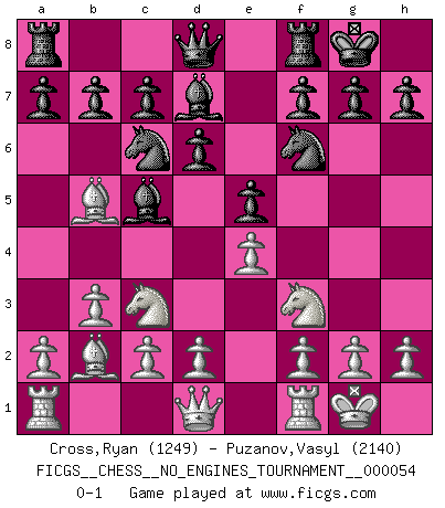 Last move : 0-1 2012 June 1 2:56:18 [Event "FICGS__CHESS__NO_ENGINES_TOURNAMENT__000054"] [Site "FICGS"] [Date "2012.03.30"] [Round "1"] [White "Cross,Ryan"] [Black "Puzanov,Vasyl"] [Result "0-1"] [WhiteElo "1249"] [BlackElo "2140"] 1.e4 e5 2.Nf3 Nc6 3.Nc3 Bc5 4.b3 d6 5.Bb2 Nf6 6.Bb5 O-O 7.O-O Bd7 0-1 This chess game has been lost on time (started : 2012.03.30 17:8:50) Three knights game Kingside Castling by player Black (move 6) Kingside Castling by player White (move 7) Player Black won this chess game. Follow this game move after move (download)You may learn much more from a game you lose than from a game you win. You will have to lose hundreds of games before becoming a good player. (Jose Raul Capablanca) Schach ist eine Sache der genauen Beurteilung, wann man zuschlagen und wann man sich ducken muss. (Robert James Fischer) Robert Fischer es la ley hacia si mismo. (Larry Evans) Comme les marins qui ont mille raisons différentes d'aller en mer, les joueurs d'échecs en ont tout autant avant de s'installer devant une table et jouer... (Vincent Bertignac, philosophe) Good decisions come from experience, and experience comes from bad decisions. (Anonymous)
