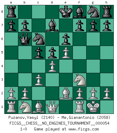 Last move : 1-0 2012 August 15 13:22:43 [Event "FICGS__CHESS__NO_ENGINES_TOURNAMENT__000054"] [Site "FICGS"] [Date "2012.03.30"] [Round "1"] [White "Puzanov,Vasyl"] [Black "Me,Gianantonio"] [Result "1-0"] [WhiteElo "2140"] [BlackElo "2058"] 1.e4 e6 2.d4 d5 3.e5 c5 4.c3 Nc6 5.Nf3 Bd7 6.Be2 Qb6 7.O-O 1-0 This chess game has been lost on time (started : 2012.03.30 17:8:50) French : Advance, Euwe variation Kingside Castling by player White (move 7) Player White won this chess game. Follow this game move after move (download)Look at Garry Kasparov. After he loses, invariably he wins the next game. He just kills the next guy. That's something that we have to learn to be able to do. (Maurice Ashley) Drei Punkte vor allen anderen ist wie einer, der im weißen Anzug posiert, während der Rest in Müllsäcke gekleidet dasteht. (Viktor Kortschnoi) La enorme capacidad mental, en la que sin ella no puede un jugador de Ajedrez existir, es demasiado requerida por el Ajedrez al grado de que nunca podrá liberar su mente de este juego. (Albert Einstein) Horreur, mais aussi harmonie suprême : qu'y avait-il en effet au monde en dehors des échecs ? Le brouillard, l'inconnu, le non-être... (Vladimir Nabokov) The large trees attract high winds. (Chinese proverb)
