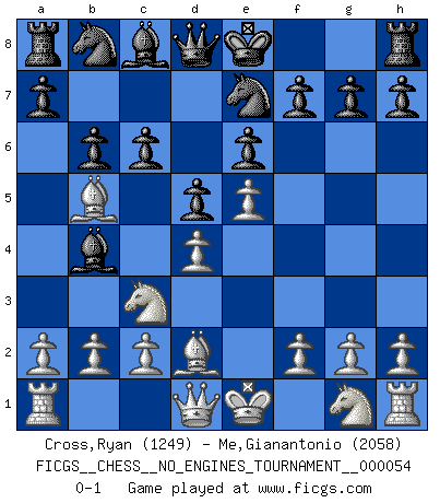 Last move : 0-1 2012 August 23 2:5:26 [Event "FICGS__CHESS__NO_ENGINES_TOURNAMENT__000054"] [Site "FICGS"] [Date "2012.03.30"] [Round "1"] [White "Cross,Ryan"] [Black "Me,Gianantonio"] [Result "0-1"] [WhiteElo "1249"] [BlackElo "2058"] 1.e4 e6 2.d4 d5 3.Nc3 Bb4 4.Bd2 Ne7 5.e5 b6 6.Bb5+ c6 0-1 This chess game has been lost on time (started : 2012.03.30 17:8:50) French : Winawer, fingerslip variation Player Black won this chess game. Follow this game move after move (download)Chess is a terrible game. If you have no center, your opponent has a freer position. If you do have a center, then you really have something to worry about ! (Siegbert Tarrasch) Wie ich sie so einen nach dem anderen nieder mähte wurde meine Überlegenheit offensichtlich. (José Raúl Capablanca) El Ajedrez es la vida. (Bobby Fischer) Aux échecs, les retours au sommet sont rares : les dommages psychologiques consécutifs à une défaite sont trop sévères. (Daily Telegraph) All politicians must be presumed guilty until they are proven innocent. (Dinesh De Silva)
