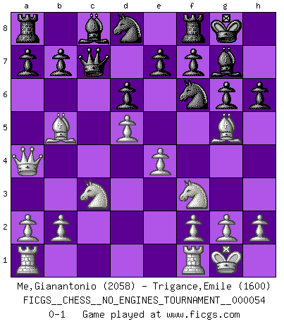 Last move : 0-1 2012 September 6 5:19:7 [Event "FICGS__CHESS__NO_ENGINES_TOURNAMENT__000054"] [Site "FICGS"] [Date "2012.03.30"] [Round "1"] [White "Me,Gianantonio"] [Black "Trigance,Emile"] [Result "0-1"] [WhiteElo "2058"] [BlackElo "1600"] 1.e4 c5 2.Nf3 Nc6 3.Bb5 g6 4.O-O Bg7 5.c3 Nf6 6.Qa4 O-O 7.d4 cxd4 8.cxd4 Qc7 9.Nc3 d6 10.d5 Nd8 11.Bg5 h6 0-1 This chess game has been lost on time (started : 2012.03.30 17:8:50) Sicilian : Nimzovich-Rossolimo attack (with ...g6, without ...d6) Kingside Castling by player White (move 4) Kingside Castling by player Black (move 6) Player Black won this chess game. Follow this game move after move (download)The Pin is mightier than the sword. (Fred Reinfeld) Später, ... hatte ich zunehmend Erfolg in entscheidenden Partien. Vielleicht weil ich eine einfache Wahrheit erkannte: nicht nur ich hatte Angst, auch mein Gegner. (Mikhail Nekhemyevich Tal) La caracteristica mas importante en la posición del Ajedrez es la actividad de las piezas. Esto es absolutamente fundamental en todas las fases del juego: Apertura, Juego Medio y especialmente Finales. La limitación primordial en la actividad de una pieza, es la estructuración de los Peones. (Michael Stean) Il n'y a pas de prix trop élevé au scalp de l'ennemi. (Koblentz) Art is the only way to run away without leaving home. (Twyla Tharp)