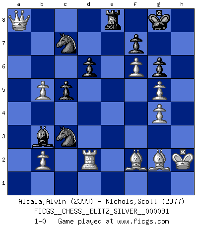 Last move : 1-0 2012 March 30 21:35:56 [Event "FICGS__CHESS__BLITZ_SILVER__000091"] [Site "FICGS"] [Date "2012.03.30"] [Round "1"] [White "Alcala,Alvin"] [Black "Nichols,Scott"] [Result "1-0"] [WhiteElo "2399"] [BlackElo "2377"] 1.d4 Nf6 2.c4 g6 3.Nc3 Bg7 4.e4 d6 5.f3 O-O 6.Be3 c5 7.Nge2 b6 8.Qd2 Nc6 9.d5 Ne5 10.Ng3 h5 11.Be2 h4 12.Nf1 h3 13.g4 a6 14.a4 e6 15.g5 Ne8 16.Rg1 exd5 17.exd5 Nc7 18.f4 Nd7 19.f5 Be5 20.Ng3 Rb8 21.Nge4 Ne8 22.f6 b5 23.axb5 axb5 24.Nxb5 Rxb5 25.cxb5 Nb6 26.Bf4 Bd4 27.Rg3 Bf5 28.Nc3 Nc7 29.Be3 Be5 30.Bf2 Qd7 31.Ra7 Qc8 32.Kf1 Qb8 33.Ra1 Rd8 34.Kg1 Qb7 35.Re1 Rb8 36.Rd1 Rd8 37.Qe3 Re8 38.Qf3 Bxg3 39.hxg3 Bc2 40.Rd2 Bb3 41.g4 Nbxd5 42.Bf1 h2+ 43.Kxh2 Qa8 44.Bg2 Nxc3 45.Qxa8 1-0 King's Indian : Saemisch, 5...O-O Kingside Castling by player Black (move 5) Player White won this chess game. Follow this game move after move (download)Chess is a sea in which a gnat may drink and an elephant may bathe. (Hindu proverb) Sicherlich können nur Meister einen Stil haben. Daß ein nicht-Meister auch nur ein einziges Mal in seinem Leben eine Partie folgerecht durchführte, habe ich niemals bemerkt. (Emanuel Lasker) Ciertamente, de todas la drogas del mundo, el Ajedrez debe ser el mas placentero permamentemente. (Assiac) Je ne crois pas en la psychologie, je crois aux bons coups. (Robert Fischer) Life doesn't imitate art, it imitates bad television. (Woody Allen)