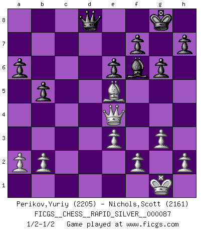 Last move : 1/2-1/2 2012 April 17 17:51:34 [Event "FICGS__CHESS__RAPID_SILVER__000087"] [Site "FICGS"] [Date "2012.04.02"] [Round "1"] [White "Perikov,Yuriy"] [Black "Nichols,Scott"] [Result "1/2-1/2"] [WhiteElo "2205"] [BlackElo "2161"] 1.d4 Nf6 2.Nf3 d5 3.c4 c6 4.Nc3 e6 5.e3 Nbd7 6.Qc2 Bd6 7.Bd3 O-O 8.O-O dxc4 9.Bxc4 a6 10.Rd1 b5 11.Bd3 Qc7 12.Bd2 c5 13.dxc5 Qxc5 14.Qb1 Bb7 15.Ne4 Nxe4 16.Bxe4 Bxe4 17.Qxe4 Nf6 18.Qd3 Qb6 19.Rac1 Rad8 20.Qc2 Rd7 21.Bc3 Rc7 22.Qd3 Be7 23.Be5 R7c8 24.Ng5 g6 25.Ne4 Rcd8 26.Nxf6+ Bxf6 27.Qe4 Rxd1+ 28.Rxd1 Rd8 29.Rxd8+ Qxd8 30.g3 1/2-1/2 Queen's pawn game Kingside Castling by player Black (move 7) Kingside Castling by player White (move 8) This chess game ended in a draw. Follow this game move after move (download)The battle for the ultimate truth will never be won. And that's why Chess is so fascinating. (Hans Kmoch) Um dein Spiel zu verbessern musst du zuallererst das Endspiel studieren, denn diese kann unabhängig studiert werden. Die Eröffnung und das Mittelspiel müssen immer in Bezug gesetzt werden zum Endspiel. (José Raúl Capablanca) El Ajedrez demanda una total concentración. (Bobby Fischer) Botvinnik disait en comparant les échecs à la musique: Il existe une science dont le but est l'étude de l'acoustique et des sons. Mais il y a aussi un art qui se sert de l'océan des sons : c'est la musique. De toute évidence, il en est de même pour la pensée. La logique est l'étude des lois de la réflexion et les échecs reflètent, en tant qu'art, le côté logique de la réflexion, sous la forme d'images artistiques... Extrait de Fischer - Spassky, Reykjavik 1972 par Alexander & F. Wyndham (Ed. Solar), p 37. A good aphorism is too hard for the tooth of time, and is not worn away with the centuries, although it serves as food for every speech. (Friedrich Nietzsche)
