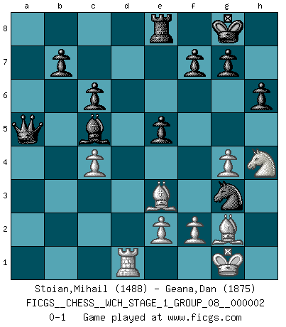 Last move : 0-1 2007 February 14 16:42:50 [Event "FICGS__CHESS__WCH_STAGE_1_GROUP_08__000002"] [Site "FICGS"] [Date "2007.01.16"] [Round "1"] [White "Stoian,Mihail"] [Black "Geana,Dan"] [Result "0-1"] [WhiteElo "1488"] [BlackElo "1875"] 1.Nf3 Nf6 2.g3 d5 3.Bg2 c6 4.O-O Bg4 5.c4 e6 6.d3 Nbd7 7.Nc3 Be7 8.Bg5 O-O 9.Rc1 h6 10.Bd2 dxc4 11.dxc4 Qc7 12.Qc2 Rad8 13.Rfd1 Rfe8 14.a3 e5 15.b4 a5 16.Be3 axb4 17.axb4 Bxb4 18.Ne4 Nxe4 19.Qxe4 Nf6 20.h3 Nxe4 21.hxg4 Qa5 22.Ra1 Rxd1+ 23.Rxd1 Bc5 24.Nh4 Nxg3 0-1 Reti Opening Kingside Castling by player White (move 4) Kingside Castling by player Black (move 8) Player Black won this chess game. Follow this game move after move (download)If Chess is a science, it's a most inexact one. If Chess is an art, it is too exacting to be seen as one. If Chess is a sport, it's too esoteric. If Chess is a game, it's too demanding to be just a game. If Chess is a mistress, she's a demanding one. If Chess is a passion, it's a rewarding one. If Chess is life, it's a sad one. (Unknown) Mutter, ich bin eben Ex-Weltmeister geworden. --beim nach Hause Kommen nach dem Verlust des WM-Titels an Mihail Botvinnik -- (Mikhail Nekhemyevich Tal) Hay dos clases de hombres: aquellos que se conforman en dejarse llevar por las circunstancias y que juegan barajas y aquellos decididos a controlar las circunstancias y que juegan al Ajedrez. (Mortimer Collins) Aidez vos pièces, elles vous aideront. (Paul Morphy) If you work for a living, why do you kill yourself working ? (Tuco to a chicken in The Good, The Bad and The Ugly)