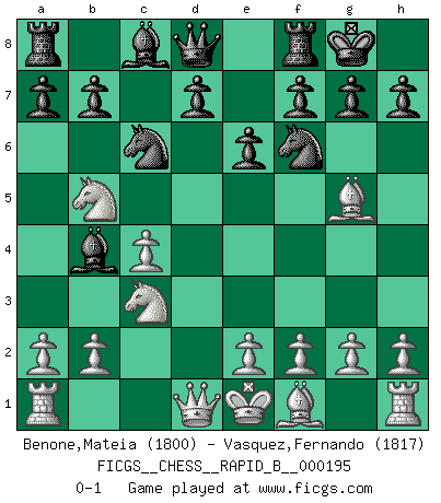 Last move : 0-1 2012 May 22 13:58:34 [Event "FICGS__CHESS__RAPID_B__000195"] [Site "FICGS"] [Date "2012.04.02"] [Round "1"] [White "Benone,Mateia"] [Black "Vasquez,Fernando"] [Result "0-1"] [WhiteElo "1800"] [BlackElo "1817"] 1.Nf3 Nf6 2.c4 c5 3.Nc3 Nc6 4.d4 cxd4 5.Nxd4 e6 6.Ndb5 Bb4 7.Bg5 O-O 0-1 This chess game has been lost on time (started : 2012.04.02 15:52:8) Reti Opening Kingside Castling by player Black (move 7) Player Black won this chess game. Follow this game move after move (download)The hardest game to win is a won game. (Emanuel Lasker) In Buenos Aires ist es nicht mein vorrangiges Ziel ein starkes Turnier zu organisieren, sondern ein Turnier für Gentlemen. Ich würde nie Kamsky einladen. Ich mag keine Probleme. (Miguel Najdorf) Cada Peón es potencialmente una Reina. (James Mason) Les échecs sont un jeu terrible. Si vous n'avez pas le centre, votre adversaire a une position plus libre. Par contre, si vous avez le centre, alors vous avez vraiment quelque chose pour laquelle vous inquiéter ! (Siegbert Tarrasch) He who fights with monsters should be careful lest he thereby become a monster. (Friedrich Nietzsche, Beyond Good and Evil)