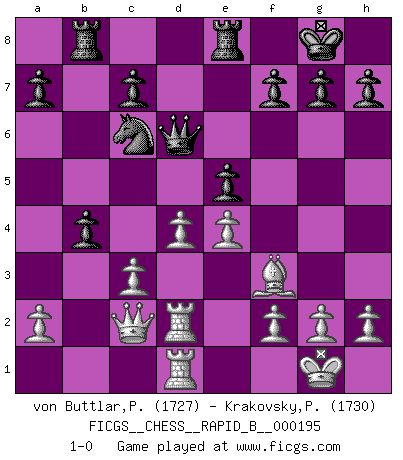 Last move : 1-0 2012 August 19 13:41:24 [Event "FICGS__CHESS__RAPID_B__000195"] [Site "FICGS"] [Date "2012.04.02"] [Round "1"] [White "von Buttlar,Paul"] [Black "Krakovsky,Peter"] [Result "1-0"] [WhiteElo "1727"] [BlackElo "1730"] 1.c4 e5 2.Nc3 Nf6 3.Nf3 Nc6 4.e3 Bb4 5.Qc2 O-O 6.d3 Re8 7.Bd2 Bxc3 8.Bxc3 d5 9.cxd5 Nxd5 10.Be2 Bf5 11.e4 Nxc3 12.bxc3 Bg4 13.O-O Bxf3 14.Bxf3 Qd6 15.Rad1 b5 16.Rd2 Rab8 17.Rfd1 b4 18.d4 1-0 This chess game has been lost on time (started : 2012.04.02 15:52:8) English Opening Kingside Castling by player Black (move 5) Kingside Castling by player White (move 13) Player White won this chess game. Follow this game move after move (download)I am the best player in the world and I am here to prove it. (Bobby Fischer) Obendrein hat der FIDE-Präsident den Revolutionsführer Gaddafi zum »Großmeister« ernannt, am Ende der WM. Das ist lächerlich! (Joel Lautier) Botvinnik trató de alejar el misterio referente al Ajedrez, siempre relacionandolo a situaciones de la vida diaria. Solía llamar al Ajedrez un problema inexacto típico, similar a aquellos en que la gente tiene siempre que resolver a cada día. (Garry Kasparov) Une platitude souvent récitée à propos des Echecs est qu'une des choses les plus difficiles à réaliser est de gagner une position gagnante. Cela ne manque pas de sens mais, pour ma part, j'ai toujours trouvé plus difficile de gagner une position perdante. (Tim Krabbe) Everything in life is luck. (Donald Trump)