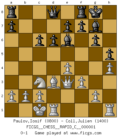 Last move : 0-1 2006 May 22 20:32:3 [Event "FICGS__CHESS__RAPID_C__000001"] [Site "FICGS"] [Date "2006.05.12"] [Round "1"] [White "Paulov,Iosif"] [Black "Coll,Julien"] [Result "0-1"] [WhiteElo "0800"] [BlackElo "1400"] 1.e4 c5 2.Nf3 d6 3.d4 cxd4 4.Nxd4 Nf6 5.Nc3 g6 6.Bc4 Bg7 7.Be3 O-O 8.Qd2 Ng4 9.O-O-O Nxe3 10.Qxe3 Nc6 11.Nxc6 bxc6 12.h4 h5 13.Bd3 Be6 14.f3 0-1 Sicilian : Dragon variation Kingside Castling by player Black (move 7) Queenside Castling by player White (move 9) Player Black won this chess game. Follow this game move after move (download)You may learn much more from a game you lose than from a game you win. You will have to lose hundreds of games before becoming a good player. (Jose Raul Capablanca) Ich verachte die Medien. (Robert James Fischer) Morphy probablemente fue el genio más grande de todos. (Bobby Fischer) Votre prénom est 'Tactique', votre deuxième prénom est 'Tactique' et votre nom est 'Tactique'. (Ken Smith) Perseverance does not equal worthiness. Next time you want to get my attention, wear something fun. Low-riding jeans are hot. (Gregory House, House M.D.)