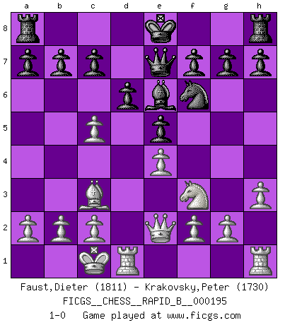 Last move : 1-0 2012 August 16 13:31:49 [Event "FICGS__CHESS__RAPID_B__000195"] [Site "FICGS"] [Date "2012.04.02"] [Round "1"] [White "Faust,Dieter"] [Black "Krakovsky,Peter"] [Result "1-0"] [WhiteElo "1811"] [BlackElo "1730"] 1.e4 e5 2.Nc3 Nf6 3.Bc4 Nc6 4.d3 Na5 5.Nf3 Nxc4 6.dxc4 Bb4 7.Bd2 d6 8.Qe2 Bg4 9.O-O-O Bxc3 10.Bxc3 Qe7 11.h3 Be6 12.c5 1-0 This chess game has been lost on time (started : 2012.04.02 15:52:8) Vienna game Queenside Castling by player White (move 9) Player White won this chess game. Follow this game move after move (download)Chess is above all, a fight ! (Emanuel Lasker) Ein bischen Romantik kann weder im Schach noch in der Liebe schaden. Also versuche ich mich ab und zu daran zu erinnern. (Nigel Short) Aquellos que dicen entender al Ajedrez, no entienden nada. (Robert Hubner) Donnez-moi un Cavalier en 6e et je gagnerais toutes mes parties. (Steinitz) The various flowers seem good to different people. (Chinese proverb)