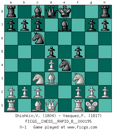 Last move : 0-1 2012 May 19 13:45:47 [Event "FICGS__CHESS__RAPID_B__000195"] [Site "FICGS"] [Date "2012.04.02"] [Round "1"] [White "Shishkin,Viktor"] [Black "Vasquez,Fernando"] [Result "0-1"] [WhiteElo "1804"] [BlackElo "1817"] 1.e4 e5 2.Nf3 Nf6 3.Nxe5 d6 4.Nf3 Nxe4 5.d4 d5 6.Bd3 Nc6 7.O-O Be7 8.Nc3 f5 0-1 This chess game has been lost on time (started : 2012.04.02 15:52:8) Petrov : Classical attack Kingside Castling by player White (move 7) Player Black won this chess game. Follow this game move after move (download)When you play Bobby, it is not a question if you win or lose. It is a question if you survive. (Boris Spassky) Der Freibauer hat für mich eine Seele, genau wie der Mensch, Wünsche, die unerkannt in ihm schlummern, und Befürchtungen, von deren Existenz er selbst kaum ahnt. (Aaron Nimzowitsch) Cuando estes solo, cuando te sientas un extraño en el mundo, juega al Ajedrez. Esto levantará tu espiritu y será tu consejero de guerra. (Aristóteles) Psychologiquement, tu dois avoir confiance en toi même, mais cette confiance doit être basée sur des faits. (Robert Fischer) First of all, we have to go back to the classical time control. (Anatoly Karpov)