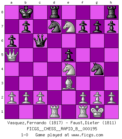 Last move : 1-0 2012 August 21 15:55:54 [Event "FICGS__CHESS__RAPID_B__000195"] [Site "FICGS"] [Date "2012.04.02"] [Round "1"] [White "Vasquez,Fernando"] [Black "Faust,Dieter"] [Result "1-0"] [WhiteElo "1817"] [BlackElo "1811"] 1.e4 e5 2.Nf3 d5 3.exd5 Qxd5 4.Nc3 Qe6 5.Bb5+ c6 6.Ba4 Qg6 7.Bb3 Be6 8.O-O Nd7 9.Bxe6 Qxe6 10.d4 O-O-O 11.d5 cxd5 12.Ng5 Qg6 13.Qxd5 Nh6 14.Be3 Be7 15.Nge4 a6 16.Qa5 Kb8 17.Rad1 Ng4 18.Nd5 Qc6 19.Nxe7 1-0 QP counter-gambit (elephant gambit) Kingside Castling by player White (move 8) Queenside Castling by player Black (move 10) Player White won this chess game. Follow this game move after move (download)The most important feature of the Chess position is the activity of the pieces. This is absolutely fundamental in all phases of the game: Opening, Middlegame and especially Endgame. The primary constraint on a piece's activity is the Pawn structure. (Michael Stean) Intelligenz läßt sich nicht am Weg, sondern nur am Ergebnis feststellen. (Garry Kasparov) Cada Peón es potencialmente una Reina. (James Mason) Même si l'adversaire joue le coup analysé précédemment, recommencez l'analyse en voyant la nouvelle position. Première règle de Blumenfeld If you are going through hell, keep going. (Winston Churchill)
