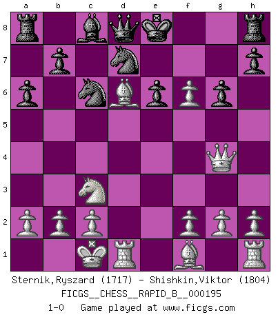 Last move : 1-0 2012 May 19 1:38:13 [Event "FICGS__CHESS__RAPID_B__000195"] [Site "FICGS"] [Date "2012.04.02"] [Round "1"] [White "Sternik,Ryszard"] [Black "Shishkin,Viktor"] [Result "1-0"] [WhiteElo "1717"] [BlackElo "1804"] 1.e4 c5 2.Nf3 e6 3.d4 cxd4 4.Nxd4 Nf6 5.Nc3 Nc6 6.Ndb5 d6 7.Bf4 Be7 8.Nxd6+ Bxd6 9.Bxd6 a6 10.e5 Nd7 11.Qg4 g6 12.O-O-O f5 13.exf6 1-0 This chess game has been lost on time (started : 2012.04.02 15:52:8) Sicilian : Anderssen variation Queenside Castling by player White (move 12) Player White won this chess game. Follow this game move after move (download)The hallmark of the artist is simplicity. (Larry Evans) Bis zum Jahr 1971 verlief in meiner Schachkariere alles glatt. Dieses dramatische Match [Fischer-Taimanov 6:0] machte mein Leben zur Hölle. (Mark Taimanov) Fischer era un maestro de claridad y un Rey del posicionamiento astuto. Sus oponentes podían ver hacia donde se dirigía pero eran impotentes para detenerlo. (Bruce Pandolfini) On croit qu'il y a plus de mauvais joueurs que de bons joueurs, c'est faux : Il y a autant de joueurs qui gagnent que de joueurs qui perdent. (Philippe Geluck) O divine art of subtlety and secrecy! Through you we learn to be invisible, through you inaudible and hence we can hold the enemy's fate in our hands. (Sun Tzu)