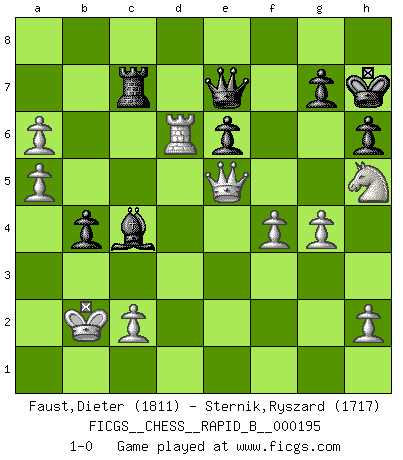 Last move : 1-0 2012 August 7 13:27:22 [Event "FICGS__CHESS__RAPID_B__000195"] [Site "FICGS"] [Date "2012.04.02"] [Round "1"] [White "Faust,Dieter"] [Black "Sternik,Ryszard"] [Result "1-0"] [WhiteElo "1811"] [BlackElo "1717"] 1.e4 c5 2.Nc3 Nc6 3.Nge2 e6 4.d4 cxd4 5.Nxd4 Qc7 6.Be3 a6 7.Qd2 Nf6 8.O-O-O Bb4 9.f3 Ne7 10.Nde2 d5 11.a3 Ba5 12.b4 Bb6 13.Bxb6 Qxb6 14.exd5 Nfxd5 15.Nf4 Nxf4 16.Qxf4 O-O 17.Kb2 h6 18.Be2 Ng6 19.Qd6 Qe3 20.Bd3 Ne5 21.Kb3 Nxd3 22.Rxd3 Qf2 23.Rd2 Qh4 24.Rhd1 b5 25.Qc7 e5 26.Qxe5 Be6+ 27.Kb2 Rfc8 28.Rd4 Qe7 29.Nd5 Qa7 30.Nf4 Re8 31.Rd6 Bc4 32.Qd4 Qe7 33.Nh5 Qg5 34.g4 Re6 35.Rxe6 fxe6 36.f4 Qe7 37.Qe5 a5 38.bxa5 b4 39.a4 Rc8 40.Rd6 Rc7 41.a6 Kh7 42.a5 1-0 Sicilian : chameleon variation Queenside Castling by player White (move 8) Kingside Castling by player Black (move 16) Player White won this chess game. Follow this game move after move (download)Chess is the art which expresses the science of logic. (Mikhail Botvinnik) Wer sich die Fähigkeit anerziehen will im Schach selbstständig zu denken, der muß alles meiden, was leblos ist: ausgeklügelte Theorien, die sich auf sehr wenige Beispiele und eine Menge Hirngespinste stützen. (Emanuel Lasker) Bobby es la celebridad menos entendida y malinterpretada que camina el la faz de esta tierra. (Yasser Seirawan) Nous sommes les pions de la mystérieuse partie d'Echecs jouée par Dieu. Il nous déplace, nous arrête, nous pousse encore, puis nous lance un à un dans la boîte du Néant. Epitaphe sur la tombe de David Janowsky (1868-1927). I don't diet. I just don't eat as much as I'd like to. (Linda Evangelista, supermodel)