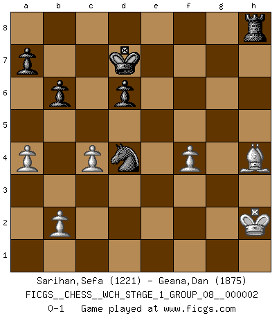 Last move : 0-1 2007 April 4 10:5:13 [Event "FICGS__CHESS__WCH_STAGE_1_GROUP_08__000002"] [Site "FICGS"] [Date "2007.01.16"] [Round "1"] [White "Sarihan,Sefa"] [Black "Geana,Dan"] [Result "0-1"] [WhiteElo "1221"] [BlackElo "1875"] 1.e4 e5 2.f4 exf4 3.Nf3 d6 4.Bc4 h6 5.O-O g5 6.d4 Bg7 7.c3 Ne7 8.Nbd2 Ng6 9.h3 Nd7 10.a4 h5 11.Qb3 Qe7 12.Nxg5 Qxg5 13.Bxf7+ Kd8 14.Nf3 Qf6 15.Bxg6 Qxg6 16.Bxf4 Bf6 17.e5 Be7 18.exd6 cxd6 19.Rae1 Rg8 20.Re2 b6 21.Qe6 Qxe6 22.Rxe6 Nf6 23.R6e1 Bxh3 24.Re2 Bg4 25.Kh2 Kd7 26.Rfe1 Rae8 27.c4 h4 28.Rd2 Nh5 29.Be3 Bxf3 30.gxf3 Bg5 31.Rde2 Ng3 32.Bxg5 Rxe2+ 33.Rxe2 Nxe2 34.Bxh4 Nxd4 35.f4 Rh8 0-1 KGA : Fischer defense Kingside Castling by player White (move 5) Player Black won this chess game. Follow this game move after move (download)The enormous mental resilience, without which no Chess player can exist, was so much taken up by Chess that he could never free his mind of this game. (Albert Einstein) Mein erstes Ziel war nicht, die Partie zu gewinnen, sondern eine Figur zu opfern. -- der junge (Wilhelm Steinitz) No hay otro maestro que tenga una voluntad terrífica de ganar. Al tablero, el irradía peligro y aún los oponentes mas fuertes tienden a congelarse como liebres cuando olfatean a una pantera. Aún sus debilidades son peligrosas. Con las blancas, su juego de apertura es predecible - te es posible hacer planes en su contra - pero es tan fuerte que tus planes casi nunca funcionan. En el juego medio, su precisión e invención son fabulosas y en finales, tú simplemente no le puedes vencer. (Experto Alemán anónimo) La conception d'un plan est le processus par lequel un joueur exploite les avantages de sa position tout en s'efforçant d'en réduire au minimum les inconvénients. Afin de garantir le succès, un plan doit toujours se fonder sur un diagnostic objectif des particularités d'une position. La conception d'un plan est d'autant plus difficile que la position est équilibrée, et grandement facilitée lorsqu'il n'existe qu'un seul plan susceptible de répondre aux exigences de la position. (Harry Golombek) There are two major products that came out of Berkeley: LSD and UNIX. We do not believe this is to be a coincidence. (Jeremy S. Anderson)