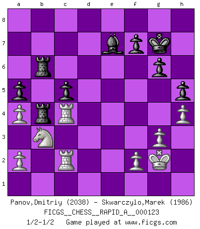 Last move : 1/2-1/2 2012 September 1 22:8:11 [Event "FICGS__CHESS__RAPID_A__000123"] [Site "FICGS"] [Date "2012.04.03"] [Round "1"] [White "Panov,Dmitriy"] [Black "Skwarczylo,Marek"] [Result "1/2-1/2"] [WhiteElo "2038"] [BlackElo "1986"] 1.e4 c5 2.c3 Nf6 3.e5 Nd5 4.d4 cxd4 5.cxd4 d6 6.Nf3 Nc6 7.Bc4 Nb6 8.Bb5 dxe5 9.Nxe5 Bd7 10.Bxc6 Bxc6 11.Nxc6 bxc6 12.O-O g6 13.Re1 Bg7 14.Bg5 O-O 15.Bxe7 Qxd4 16.Qxd4 Bxd4 17.Nd2 Rfb8 18.Rab1 Nd5 19.Nb3 Bg7 20.Bd6 Rd8 21.Ba3 a5 22.Re4 h5 23.g3 Rdb8 24.Rd1 Nb4 25.Nc1 Nc2 26.Rc4 Nxa3 27.bxa3 Bf8 28.a4 c5 29.Nb3 Rb4 30.Rdc1 Re8 31.Kf1 Kg7 32.R1c3 Reb8 33.h4 R8b6 34.Kg2 Be7 35.Rc2 1/2-1/2 Sicilian : Alapin's variation (2.c3) Kingside Castling by player White (move 12) Kingside Castling by player Black (move 14) This chess game ended in a draw. Follow this game move after move (download)Let the perfectionist play postal. (Yasser Seirawan) Der Freibauer hat für mich eine Seele, genau wie der Mensch, Wünsche, die unerkannt in ihm schlummern, und Befürchtungen, von deren Existenz er selbst kaum ahnt. (Aaron Nimzowitsch) Los Peones son el alma de una partida de Ajedrez. (Francois Andre Danican Philidor) On est toujours la mazette de quelqu'un d'autre. (Anonyme) Logic : The art of thinking and reasoning in strict accordance with the limitations and incapacities of the human misunderstanding. (Ambrose Bierce)
