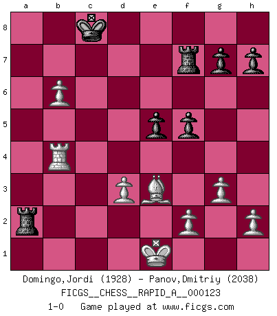 Last move : 1-0 2012 November 7 22:21:12 [Event "FICGS__CHESS__RAPID_A__000123"] [Site "FICGS"] [Date "2012.04.03"] [Round "1"] [White "Domingo,Jordi"] [Black "Panov,Dmitriy"] [Result "1-0"] [WhiteElo "1928"] [BlackElo "2038"] 1.e4 e5 2.Nf3 Nc6 3.Bc4 Nf6 4.Ng5 d5 5.exd5 Na5 6.Bb5+ c6 7.dxc6 bxc6 8.Bd3 Nd5 9.Nf3 Bd6 10.O-O Nf4 11.Re1 Nxd3 12.cxd3 O-O 13.Nc3 f6 14.Ne4 Be7 15.Qc2 Bg4 16.Re3 c5 17.b3 Nc6 18.Qc4+ Kh8 19.Nxc5 Bxc5 20.Qxc5 Bxf3 21.Rxf3 Nd4 22.Re3 Rc8 23.Qxa7 Nc2 24.Rb1 Ra8 25.Qc5 Nxe3 26.Qxe3 Qc7 27.Bb2 Qc2 28.Qe1 Rxa2 29.Bc3 Qxd3 30.Qf1 Rd8 31.Qxd3 Rxd3 32.b4 Kg8 33.b5 Rd7 34.Kf1 Rb7 35.Rb3 Ra4 36.Ke2 Kf7 37.d3 Ke6 38.Bd2 Ra2 39.b6 Kd7 40.Ke1 Kc8 41.g3 Rf7 42.Be3 f5 43.Rb4 1-0 This chess game has been lost on time (started : 2012.04.03 21:10:31) Two knights defense Kingside Castling by player White (move 10) Kingside Castling by player Black (move 12) Player White won this chess game. Follow this game move after move (download)The King is a fighting piece. Use it ! (Wilhelm Steinitz) Es hat in meinem Leben Zeiten gegeben, in denen das Schachspiel, wenn nicht zum Lebenszweck, so doch zu einem regelrechten Lebensersatz geworden ist. Man fühlt sich in solchen Zeiten nicht so, als besäße man eine göttliche Gabe, sondern eher so, als sei man von ihr besessen. (Garry Kasparov) El tablero es el mundo, las piezas es el fenomeno del universo, las reglas del juego son lo que llamamos leyes de la naturaleza y el jugador del lado opuesto, se encuentra oculto a nuestra vista. (Thomas Huxley) Dieu déplace le joueur, et celui-ci la pièce. Quel Dieu derrière Dieu commence donc la trame ? Arturo Perez-Reverte (prix de littérature policière 1993). A bird doesn't sing because it has an answer, it sings because it has a song. (Maya Angelou)
