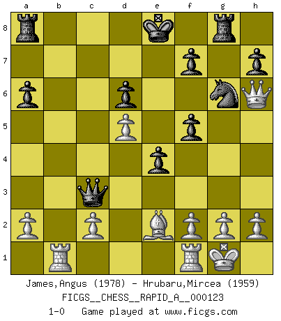 Last move : 1-0 2012 May 25 20:32:42 [Event "FICGS__CHESS__RAPID_A__000123"] [Site "FICGS"] [Date "2012.04.03"] [Round "1"] [White "James,Angus"] [Black "Hrubaru,Mircea"] [Result "1-0"] [WhiteElo "1978"] [BlackElo "1959"] 1.e4 c5 2.Nf3 Nc6 3.d4 cxd4 4.Nxd4 Nf6 5.Nc3 e5 6.Ndb5 d6 7.Bg5 a6 8.Na3 b5 9.Bxf6 gxf6 10.Nd5 f5 11.Bd3 Be6 12.O-O Bxd5 13.exd5 Ne7 14.Nxb5 Bg7 15.Nc3 e4 16.Bc4 Ng6 17.Qh5 Bxc3 18.bxc3 Qf6 19.Qh6 Rg8 20.Rab1 Qxc3 21.Be2 1-0 Sicilian : Pelikan (Lasker/Sveshnikov) variation Kingside Castling by player White (move 12) Player White won this chess game. Follow this game move after move (download)In blitz, the Knight is stronger than the Bishop. (Vlastimil Hort) Korrekt heißt in Deutschland die Haltung eines Mannes, dessen Benehmen nach dem Urteile seiner Nachbarn seiner Stellung angemessen ist. Um korrekt zu sein, muß man sich der Meinung der anderen anpassen... (Emanuel Lasker) Los tropiezos estan todos ahí en el tablero, esperando que se cometan. (Savielly Tartakover) Des idées, des idées, j'en ai cent, j'en ai mille. Des bonnes, des mauvaises, applicables, irréalisables... Il suffit de faire le tri ! (Roos) All men can see these tactics whereby I conquer, but what none can see is the strategy out of which victory is evolved. (Sun Tzu)