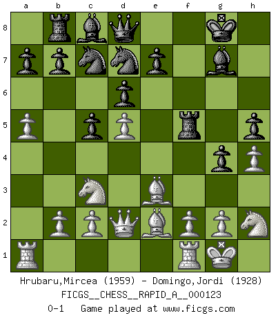 Last move : 0-1 2012 May 25 20:32:55 [Event "FICGS__CHESS__RAPID_A__000123"] [Site "FICGS"] [Date "2012.04.03"] [Round "1"] [White "Hrubaru,Mircea"] [Black "Domingo,Jordi"] [Result "0-1"] [WhiteElo "1959"] [BlackElo "1928"] 1.e4 h6 2.d4 c5 3.d5 d6 4.Nc3 g5 5.Be2 Nf6 6.Nf3 Nbd7 7.a4 Bg7 8.a5 Rb8 9.O-O O-O 10.h3 Ne8 11.Be3 Nc7 12.Qd2 f5 13.exf5 Rxf5 14.h4 g4 15.Nh2 h5 0-1 Carr's defense Kingside Castling by player White (move 9) Kingside Castling by player Black (move 9) Player Black won this chess game. Follow this game move after move (download)There are tough players and nice guys, and I'm a tough player. (Bobby Fischer) Der beste Spieler in einem Turnier gewinnt es nie. Er landet auf Platz zwei oder drei. (Siegbert Tarrasch) La mitad de las variaciones que son calculadas en una partida de torneo, resultan ser completamente superfluas. Desafortunadamente, nadie sabe por adelantado cual mitad. (Jan Tinman) J'ai toujours senti une vague pitié pour l'homme qui ne connaît rien aux échecs, tout comme j'en aurais pour un homme ignorant de l'amour. Les Echecs, comme la musique ou comme l'amour, ont le pouvoir de rendre heureux. (Siegbert Tarrasch) Life is like a ten-speed bicycle: most of us have gears we never use. (Charles M. Schulz)