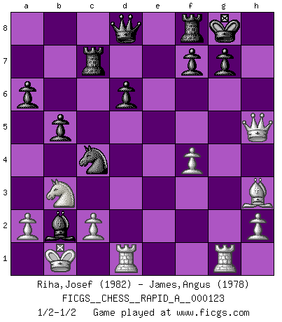 Last move : 1/2-1/2 2012 April 23 22:6:10 [Event "FICGS__CHESS__RAPID_A__000123"] [Site "FICGS"] [Date "2012.04.03"] [Round "1"] [White "Riha,Josef"] [Black "James,Angus"] [Result "1/2-1/2"] [WhiteElo "1982"] [BlackElo "1978"] 1.e4 c5 2.Nf3 d6 3.d4 cxd4 4.Nxd4 Nf6 5.Nc3 a6 6.Be3 e5 7.Nb3 Be6 8.f3 h5 9.Qd2 Nbd7 10.O-O-O Be7 11.Kb1 b5 12.g3 O-O 13.Nd5 Bxd5 14.exd5 Nb6 15.f4 Nfxd5 16.Bg2 Nxe3 17.Qxe3 Rc8 18.Bh3 exf4 19.Qf3 Rc7 20.gxf4 Bf6 21.Qxh5 Nc4 22.Rhg1 Bxb2 1/2-1/2 Sicilian : Najdorf, Byrne (English) attack Queenside Castling by player White (move 10) Kingside Castling by player Black (move 12) This chess game ended in a draw. Follow this game move after move (download)We cannot resist the fascination of sacrifice, since a passion for sacrifices is part of a Chessplayer's nature. (Rudolf Spielman) Im Blitz ist es einfacher mit einer Figur weniger anzugreifen, als sich mit einer Mehrfigur zu verteidigen. (Mikhail Nekhemyevich Tal) Las Aperturas te enseñan aperturas. ¡Los Finales te enseñan Ajedrez!. (Stephan Gerzadowicz) Pour moi, les échecs ne sont pas un jeu mais un art. (Alexandre Alekhine) A woman without a man is like a fish without a bicycle. (Gloria Steinem)