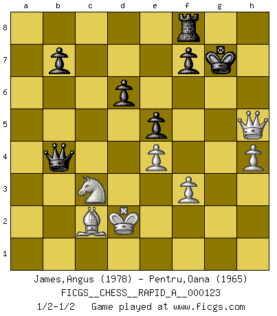 Last move : 1/2-1/2 2012 August 26 9:50:0 [Event "FICGS__CHESS__RAPID_A__000123"] [Site "FICGS"] [Date "2012.04.03"] [Round "1"] [White "James,Angus"] [Black "Pentru,Oana"] [Result "1/2-1/2"] [WhiteElo "1978"] [BlackElo "1965"] 1.e4 c5 2.Nf3 d6 3.d4 cxd4 4.Nxd4 Nf6 5.Nc3 g6 6.Be3 Bg7 7.f3 O-O 8.Qd2 Nc6 9.g4 Nxd4 10.Bxd4 Be6 11.h4 h5 12.O-O-O Rc8 13.gxh5 Nxh5 14.Bxg7 Kxg7 15.Qd4+ Kh7 16.Qxa7 Ra8 17.Qe3 Bxa2 18.b3 Qa5 19.Rd5 Qa3+ 20.Kd2 Bxb3 21.cxb3 Qb2+ 22.Ke1 Qxb3 23.Rb5 Ra1+ 24.Kd2 Qa3 25.Rxh5+ gxh5 26.Bd3 e5 27.Rxa1 Qxa1 28.Qg5 Qb2+ 29.Bc2 Qb4 30.Qxh5+ Kg7 31.Qg4+ Kh7 32.Qf5+ Kg7 33.Qg5+ Kh8 34.Qh5+ Kg7 35.Qg4+ Kh8 36.Qh5+ Kg7 1/2-1/2 Sicilian : Dragon, Yugoslav attack, 7...O-O Kingside Castling by player Black (move 7) Queenside Castling by player White (move 12) This chess game ended in a draw. Follow this game move after move (download)The battle for the ultimate truth will never be won. And that's why Chess is so fascinating. (Hans Kmoch) Es ist peinlich, dass ich nie Weltmeister wurde. Es wäre leicht, Leonid Breschnjew als Ursache vorzuschieben, dessen Apparat den Vorzeigekommunisten Anatoli Karpow in allem unterstützte. Aber Garri Kasparow zum Beispiel, der ebenfalls von den Sowjets unerwünscht war, hat trotz der Widerstände den WM-Titel erobert. (Viktor Kortschnoi) Fischer es el jugador mas fuerte del mundo. De hecho, el jugador mas fuerte que jamas haya existido. (Larry Evans) Un millionnaire : 'Monsieur Steinitz ! Vous ne participez aux tournois que pour l'argent, alors que moi je n'y viens que pour l'honneur.' Steinitz : 'Chacun joue pour ce qu'il n'a pas'... Convictions are more dangerous enemies of truth than lies. (Friedrich Nietzsche)