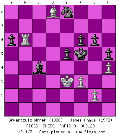 Last move : 1/2-1/2 2012 September 25 10:29:5 [Event "FICGS__CHESS__RAPID_A__000123"] [Site "FICGS"] [Date "2012.04.03"] [Round "1"] [White "Skwarczylo,Marek"] [Black "James,Angus"] [Result "1/2-1/2"] [WhiteElo "1986"] [BlackElo "1978"] 1.d4 d5 2.c4 e6 3.Nf3 Nf6 4.e3 dxc4 5.Bxc4 c5 6.Nc3 a6 7.a4 Nc6 8.O-O Be7 9.Qe2 cxd4 10.Rd1 O-O 11.Nxd4 Nxd4 12.exd4 Re8 13.Bf4 Bd7 14.d5 e5 15.Bg5 Bg4 16.f3 Bf5 17.Kh1 Rc8 18.d6 Bxd6 19.Bd5 Rc7 20.Be4 Be6 21.Bc2 Rd7 22.a5 Bb4 23.Ba4 Rxd1+ 24.Rxd1 Qxa5 25.Bxe8 Nxe8 26.Bd8 Qc5 27.Qe4 Bxc3 28.bxc3 Qb5 29.Be7 f6 30.h3 Kf7 31.Bd8 g6 32.Kh2 Bf5 33.c4 Qb4 34.Qd5+ Be6 35.Qa5 Qxa5 36.Bxa5 Bxc4 37.Rd7+ Ke6 38.Rxb7 h5 39.Bd8 Kd6 40.Rb6+ Kc5 41.h4 Bb5 42.Rb7 Kd6 43.Kg1 Ke6 44.Kf2 Kf5 45.Rb6 Bc4 46.Ke3 1/2-1/2 Queen's gambit declined Kingside Castling by player White (move 8) Kingside Castling by player Black (move 10) This chess game ended in a draw. Follow this game move after move (download)I guess a certain amount of temperament is expected of Chess geniuses. (Ron Gross) Wie gewinnt Tal? Er entwickelt alle seine Figuren in die Brettmitte und opfert sie dann irgendwo. (Robert James Fischer) No es suficiente ser un buen jugador, se debe también de jugar bién. (Siegbert Tarrasch) Le jeu d'échecs fait naître et fortifie en nous plusieurs qualités précieuses dans le cours de l'existence, telles que la prévoyance, la circonspection, la prudence, et la persévérance. (Benjamin Franklin - 1783, la morale des échecs) The ultimate in disposing one's troops is to be without ascertainable shape. Then the most penetrating spies cannot pry in nor can the wise lay plans against you. (Sun Tzu)