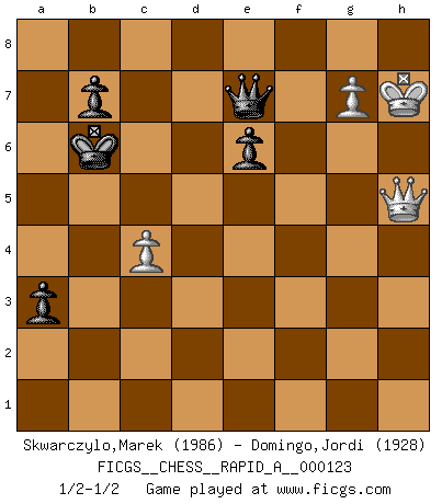 Last move : 1/2-1/2 2012 November 5 13:50:42 [Event "FICGS__CHESS__RAPID_A__000123"] [Site "FICGS"] [Date "2012.04.03"] [Round "1"] [White "Skwarczylo,Marek"] [Black "Domingo,Jordi"] [Result "1/2-1/2"] [WhiteElo "1986"] [BlackElo "1928"] 1.d4 h6 2.e4 c5 3.d5 d6 4.Nc3 g5 5.h4 g4 6.Bb5+ Nd7 7.Qxg4 Ngf6 8.Qf4 Rg8 9.g3 Ng4 10.a4 Bg7 11.Nf3 a6 12.Be2 h5 13.Qd2 Nde5 14.Nxe5 Bxe5 15.a5 Bd7 16.Nd1 e6 17.Bc4 Qc7 18.c3 O-O-O 19.Ne3 Rde8 20.Qe2 Kb8 21.Qf3 Bc8 22.O-O Nxe3 23.Bxe3 Rg4 24.dxe6 fxe6 25.Bd3 Reg8 26.Bg5 d5 27.Kh1 c4 28.Bc2 Bd7 29.Qe3 dxe4 30.Bd1 R4xg5 31.hxg5 Bc6 32.Kg2 h4 33.Be2 hxg3 34.fxg3 Qe7 35.Bxc4 Rxg5 36.Rf8+ Qxf8 37.Qxg5 e3 38.Kh3 Bc7 39.Rf1 Qh8+ 40.Qh4 Qg7 41.Be2 Bxa5 42.Qh5 Bc7 43.g4 Qg8 44.Qh6 Bd6 45.Rf6 Ka8 46.Qxe3 Qh7+ 47.Rh6 Qb1 48.Rh8+ Bb8 49.Rxb8+ Kxb8 50.g5 Kc7 51.Kg3 a5 52.Bg4 a4 53.Kf4 Qxb2 54.g6 Qh2+ 55.Kg5 Qd6 56.g7 Qe7+ 57.Kg6 Be8+ 58.Kh7 Bf7 59.Qe5+ Kb6 60.Qd4+ Kc7 61.Qc4+ Kb6 62.Qd4+ Kc7 63.Qe5+ Kb6 64.Bh5 Bxh5 65.Qxh5 a3 66.c4 1/2-1/2 Queen's pawn Queenside Castling by player Black (move 18) Kingside Castling by player White (move 22) 10 pieces endgame at move 64 : White KQPP , Black KQBPPP WHITE : King + 1 Queen 2 Pawns BLACK : King + 1 Queen 1 Bishop 3 Pawns 9 pieces endgame at move 65 : White KQPP , Black KQPPP WHITE : King + 1 Queen 2 Pawns BLACK : King + 1 Queen 3 Pawns This chess game ended in a draw. Follow this game move after move (download)You know, comrade Pachman, I don't enjoy being a Minister, I would rather play Chess like you. (Che Guevara) Ich bin es gewohnt, das die Jugend mir überhaupt keinen Respekt entgegenbringt. (Alexander Morozewich) Si tu oponente te ofrece un empate, trata de averiguar porque piensa él que esta en una posición peor. (Nigel Short) Aux échecs, l'amour-propre est satisfait quand on remporte la victoire, mais il n'y a pas de honte à être battu. (Benjamin Franklin) Panic is a sudden desertion of us, an a going over to the enemy of our imagination. (Christian Nevell Bovee)