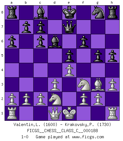 Last move : 1-0 2012 June 2 15:1:23 [Event "FICGS__CHESS__CLASS_C__000188"] [Site "FICGS"] [Date "2012.04.05"] [Round "1"] [White "Valentin,Laurentiu"] [Black "Krakovsky,Peter"] [Result "1-0"] [WhiteElo "1600"] [BlackElo "1730"] 1.e4 e5 2.Nf3 Nc6 3.Bb5 a6 4.Bxc6 dxc6 5.d3 Bd6 6.Bg5 f6 7.Bh4 Qe7 8.Nbd2 g5 9.Bg3 h5 10.h3 1-0 This chess game has been lost on time (started : 2012.04.05 1:26:29) Ruy Lopez : Exchange variation Player White won this chess game. Follow this game move after move (download)Good offense and good defense both begin with good development. (Bruce A. Moon) Ich könnte leicht behaupten: Ja,ja, Leonid Breschnew wollte nicht, daß ich Weltmeister werde. In der Tat war die Sache komplizierter. (Viktor Kortschnoi) El arma más poderosa en el Ajedrez, es tener la próxima movida. (David Bronstein) Avant la finale, les dieux ont créé le milieu de partie. (Tarrasch) You lose, general Kenobi. (General Grievous in Star Wars ep.3)