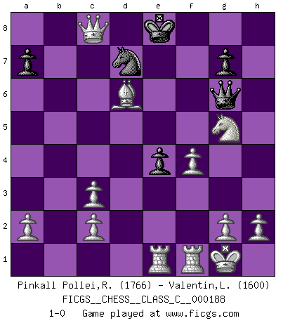 Last move : 1-0 2012 June 6 21:34:55 [Event "FICGS__CHESS__CLASS_C__000188"] [Site "FICGS"] [Date "2012.04.05"] [Round "1"] [White "Pinkall Pollei,Rich"] [Black "Valentin,Laurentiu"] [Result "1-0"] [WhiteElo "1766"] [BlackElo "1600"] 1.e4 e6 2.d4 d5 3.Nc3 Bb4 4.e5 Bxc3+ 5.bxc3 Ne7 6.Qg4 O-O 7.Nf3 Ng6 8.Bd3 f5 9.exf6 Qxf6 10.Qh5 Nd7 11.O-O e5 12.Ng5 Rd8 13.Qxh7+ Kf8 14.Bxg6 Ke7 15.Ba3+ c5 16.dxc5 Nf8 17.c6+ Rd6 18.Qg8 Qxg6 19.f4 e4 20.Qxd5 bxc6 21.Bxd6+ Ke8 22.Qxc6+ Nd7 23.Rae1 Bb7 24.Qxb7 Rc8 25.Qxc8+ 1-0 French : Winawer, Advance variation Kingside Castling by player Black (move 6) Kingside Castling by player White (move 11) Player White won this chess game. Follow this game move after move (download)Mistrust is the most necessary characteristic of the Chess player. (Siegbert Tarrasch) Stil? Ich habe keinen Stil! (Anatoly Karpov) El Ajedrez tiene tanto misterio como las mujeres. (Purdy) Le profane ne songe pas à la somme de jouissance dont il se prive, qui méconnaît ce jeu aux ressources aussi variées que passionnantes. (Jean-Marie Jeanton-Lamarche) No, I am still playing. (Anatoly Karpov)