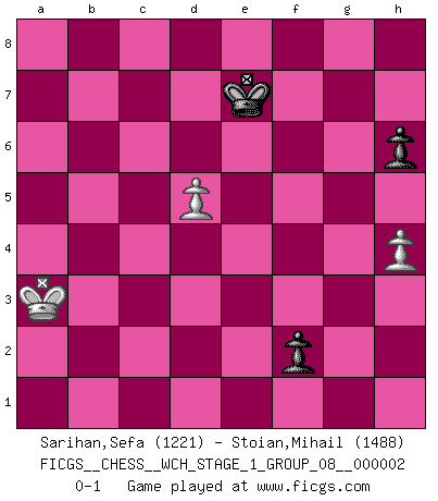 Last move : 0-1 2007 April 18 7:21:35 [Event "FICGS__CHESS__WCH_STAGE_1_GROUP_08__000002"] [Site "FICGS"] [Date "2007.01.16"] [Round "1"] [White "Sarihan,Sefa"] [Black "Stoian,Mihail"] [Result "0-1"] [WhiteElo "1221"] [BlackElo "1488"] 1.e4 e6 2.d4 d5 3.exd5 exd5 4.Nf3 Nf6 5.Bd3 Bd6 6.O-O O-O 7.h3 c6 8.Bg5 Re8 9.Nbd2 Nbd7 10.c3 h6 11.Bh4 Nf8 12.Qc2 Be6 13.Rae1 Be7 14.Ne5 N6d7 15.Bxe7 Qxe7 16.Ndf3 Qf6 17.g4 Nxe5 18.Nxe5 Qh4 19.Kg2 Rac8 20.f4 c5 21.f5 Bd7 22.Qf2 Qxf2+ 23.Kxf2 c4 24.Bc2 Bc6 25.h4 Nd7 26.g5 Nxe5 27.Rxe5 f6 28.gxf6 gxf6 29.Re6 Kf7 30.Rfe1 Rxe6 31.fxe6+ Ke7 32.Bf5 Rg8 33.Rg1 Rxg1 34.Kxg1 a5 35.Kf2 Be8 36.b3 Bh5 37.bxc4 dxc4 38.Ke3 b5 39.d5 Kd6 40.Kd4 Bf3 41.Be4 Bxe4 42.Kxe4 b4 43.cxb4 axb4 44.Kd4 c3 45.Kd3 f5 46.a4 bxa3 47.Kxc3 f4 48.Kb3 f3 49.Kxa3 f2 50.e7 Kxe7 0-1 French : Exchange variation Kingside Castling by player White (move 6) Kingside Castling by player Black (move 6) 10 pieces endgame at move 43 : White KPPPP , Black KPPPP WHITE : King + 4 Pawns BLACK : King + 4 Pawns 9 pieces endgame at move 46 : White KPPP , Black KPPPP WHITE : King + 3 Pawns BLACK : King + 4 Pawns 8 pieces endgame at move 47 : White KPPP , Black KPPP WHITE : King + 3 Pawns BLACK : King + 3 Pawns 7 pieces endgame at move 49 : White KPPP , Black KPP WHITE : King + 3 Pawns BLACK : King + 2 Pawns 6 pieces endgame at move 50 : White KPP , Black KPP WHITE : King + 2 Pawns BLACK : King + 2 Pawns Player Black won this chess game. Follow this game move after move (download)The Pin is mightier than the sword. (Fred Reinfeld) Auf Remis zu spielen ist gewissermaßen ein Verbrechen gegen das Schachspiel. (Mikhail Nekhemyevich Tal) La caracteristica mas importante en la posición del Ajedrez es la actividad de las piezas. Esto es absolutamente fundamental en todas las fases del juego: Apertura, Juego Medio y especialmente Finales. La limitación primordial en la actividad de una pieza, es la estructuración de los Peones. (Michael Stean) Pour moi, les échecs ne sont pas un jeu mais un art. (Alexandre Alekhine) Art disturbs, science reassures. (Georges Braque, Le Jour et la Nuit)