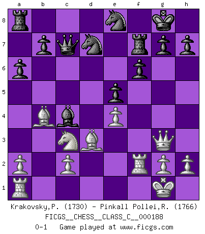 Last move : 0-1 2012 September 15 6:49:26 [Event "FICGS__CHESS__CLASS_C__000188"] [Site "FICGS"] [Date "2012.04.05"] [Round "1"] [White "Krakovsky,Peter"] [Black "Pinkall Pollei,Rich"] [Result "0-1"] [WhiteElo "1730"] [BlackElo "1766"] 1.e4 c5 2.Nf3 e6 3.d4 cxd4 4.Nxd4 a6 5.Nc3 Qc7 6.Bd3 Nf6 7.f4 Bb4 8.Bd2 Bxc3 9.bxc3 d6 10.Qf3 e5 11.fxe5 dxe5 12.Qg3 O-O 13.O-O Ne8 14.Ne2 Be6 15.Rf2 f6 16.c4 Nd7 17.Bb4 Rf7 18.Nc3 Bxc4 0-1 This chess game has been lost on time (started : 2012.04.05 1:26:29) Sicilian : Kan, 5.Nc3 Kingside Castling by player Black (move 12) Kingside Castling by player White (move 13) Player Black won this chess game. Follow this game move after move (download)Spassky will not be psyched out by Fischer. (Mike Goodall) Ich liebe den Moment, wenn ich das Ego meines Gegenüber breche. (Robert James Fischer) Si no le temes a Spassky, entonces elimino el elemento del dinero. (Jim Slater) J'ai toujours senti une vague pitié pour l'homme qui ne connaît rien aux échecs, tout comme j'en aurais pour un homme ignorant de l'amour. Les Echecs, comme la musique ou comme l'amour, ont le pouvoir de rendre heureux. (Siegbert Tarrasch) Memory is a way of holding onto the things you love, the things you are, the things you never want to lose. (from the television show: The Wonder Years)