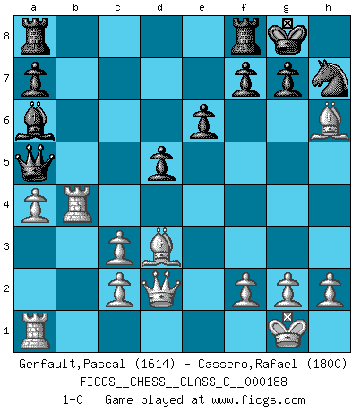 Last move : 1-0 2012 September 12 18:24:45 [Event "FICGS__CHESS__CLASS_C__000188"] [Site "FICGS"] [Date "2012.04.05"] [Round "1"] [White "Gerfault,Pascal"] [Black "Cassero,Rafael"] [Result "1-0"] [WhiteElo "1614"] [BlackElo "1800"] 1.e4 c5 2.Nf3 e6 3.d4 cxd4 4.Nxd4 Nc6 5.Nc3 Bb4 6.Nxc6 bxc6 7.Bd3 Nf6 8.O-O Bxc3 9.bxc3 h6 10.Be3 O-O 11.Qd2 Qa5 12.Rfb1 Nh7 13.a4 Ba6 14.Rb4 d5 15.exd5 cxd5 16.Bxh6 1-0 Sicilian : Taimanov variation Kingside Castling by player White (move 8) Kingside Castling by player Black (move 10) Player White won this chess game. Follow this game move after move (download)In complicated positions, Bobby Fischer hardly had to be afraid of anybody. (Paul Keres) Viele Opfer benötigen überhaupt keine konkrete Berechnung. Es genügt sich die entstehende Position kurz vorzustellen, um uns davon zu überzeugen, dass das Opfer korrekt ist. (Mikhail Nekhemyevich Tal) Los finales de Peón son del Ajedrez lo que el cesped es del Golf. (Cecil Purdy) Le plus grand jeu de l'esprit jamais inventé, plus vous l'apprenez, plus vous y prenez du plaisir. (Garry Kasparov) I couldn't make any sense out of what this particular thread is about. It sounds like R2 D2 computer speaking. A space fight ?!? Some 'command' problems in Moscow ? Some killers & narcotic addicts attacking some game & a god wannabe ?? (Dinesh De Silva, lost in a russian conflict in FICGS forum)