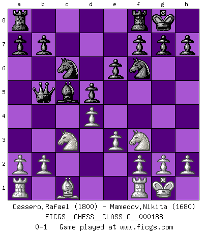 Last move : 0-1 2012 September 19 7:34:18 [Event "FICGS__CHESS__CLASS_C__000188"] [Site "FICGS"] [Date "2012.04.05"] [Round "1"] [White "Cassero,Rafael"] [Black "Mamedov,Nikita"] [Result "0-1"] [WhiteElo "1800"] [BlackElo "1680"] 1.Nf3 Nf6 2.Nc3 d5 3.e3 Bf5 4.d4 e6 5.Bd3 Bxd3 6.cxd3 c5 7.dxc5 Bxc5 8.O-O O-O 9.Qb3 Qb6 10.Qb5 Nc6 11.d4 Qxb5 0-1 Reti Opening Kingside Castling by player White (move 8) Kingside Castling by player Black (move 8) Player Black won this chess game. Follow this game move after move (download)War is the child of passion, passion is the child of narcissism and narcissism is the child. (...) Another game ? (Thibault de Vassal) Ich war zu klein für die Schach-Schülermannschaft! (Woody Allen) El Ajedrez es el juego mas altamente simbólico, pero las agresiones estan por lo tanto aún mas francamente representadas en la partida. Tal vez comenzo como un juego de guerra; Algo como la representación de una batalla en miniatura entre las fuerzas de dos reinos. (Karl Meninger) Les échecs sont utiles à l'exercice de la faculté de penser et à celle de l'imagination. Car nous devons posséder une méthode élaborée pour atteindre des buts partout où nous devons conduire notre raison. (Leibnitz) It's not enough to succeed. Others must fail. (Gore Vidal)