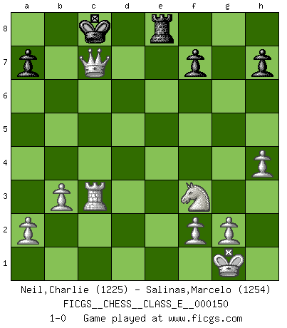 Last move : 1-0 2012 July 29 21:15:15 [Event "FICGS__CHESS__CLASS_E__000150"] [Site "FICGS"] [Date "2012.04.06"] [Round "1"] [White "Neil,Charlie"] [Black "Salinas,Marcelo"] [Result "1-0"] [WhiteElo "1225"] [BlackElo "1254"] 1.d4 e6 2.c4 Bb4+ 3.Bd2 Qe7 4.Bxb4 Qxb4+ 5.Qd2 Qxc4 6.e4 e5 7.Bxc4 exd4 8.Qxd4 Ne7 9.Qxg7 Rf8 10.Nf3 d6 11.Nc3 Be6 12.O-O Bxc4 13.Rfe1 Nbc6 14.Rac1 O-O-O 15.Nd5 b5 16.b3 Bxd5 17.exd5 Nxd5 18.Rxc6 Kb7 19.Rec1 Rde8 20.h4 b4 21.Qd4 Nc3 22.Qxb4+ Kc8 23.R1xc3 Re7 24.Qxd6 Rfe8 25.Rxc7+ Rxc7 26.Qxc7+ 1-0 Queen's pawn : Franco-Indian (Keres) defense Kingside Castling by player White (move 12) Queenside Castling by player Black (move 14) Player White won this chess game. Follow this game move after move (download)Chess is no whit inferior to the violin, and we have a large number of professional violinists. (Mikhail Botvinnik) Es ist im Leben wie im Schachspiel. Wir entwerfen einen Plan, dieser bleibt jedoch bedingt durch das, was im Schachspiel dem Gegner, im Leben dem Schicksal zu tun belieben wird. (Arthur Schopenhauer) No volvere nunca a jugar contigo. Has insultado a mi amigo. - cuando un oponente se maldijo por una mala jugada (Miguel Najdorf) Ne tendez aucun piège pour le plaisir ! Ne jouez rien dans l'espoir que l'adversaire réagisse de façon stupide ! Prenez toujours pour acquis que l'adversaire va trouver le meilleur coup ! Ne jouez jamais de coup dans l'espoir que l'adversaire ne voie pas la menace ! Chacun de vos coups doit améliorer la position d'une façon ou d'une autre. Beta. Software undergoes beta testing shortly before it's released. Beta is latin for still doesn't work. (Anonymous)