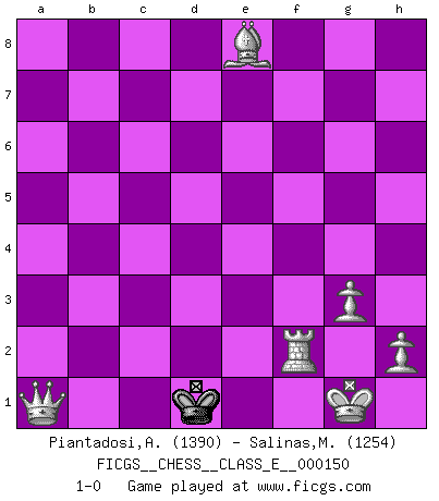 Last move : 1-0 2013 March 10 17:27:36 [Event "FICGS__CHESS__CLASS_E__000150"] [Site "FICGS"] [Date "2012.04.06"] [Round "1"] [White "Piantadosi,Angelo"] [Black "Salinas,Marcelo"] [Result "1-0"] [WhiteElo "1390"] [BlackElo "1254"] 1.e4 e6 2.d4 Qh4 3.Nf3 Qxe4+ 4.Qe2 Qc6 5.c4 Bb4+ 6.Bd2 Bxd2+ 7.Nbxd2 Na6 8.a3 d5 9.g3 Qa4 10.Bg2 Qc2 11.O-O dxc4 12.Qxc4 Qxc4 13.Nxc4 Nf6 14.Rfe1 Bd7 15.Nfe5 Nd5 16.Rac1 O-O-O 17.Nxf7 Bb5 18.Nxh8 Rxh8 19.Rxe6 Bd7 20.Re5 Nf6 21.Na5 c6 22.d5 c5 23.b4 Re8 24.Rce1 cxb4 25.d6 bxa3 26.Rxe8+ Nxe8 27.Bxb7+ Kd8 28.Bxa6 a2 29.Nb7+ Kc8 30.Nc5 Kd8 31.Nxd7 Kxd7 32.Bb5+ Kxd6 33.Bxe8 Kc5 34.Ra1 Kb4 35.Rxa2 Kb3 36.Rxa7 g5 37.Rxh7 Kc2 38.Rg7 g4 39.Rxg4 Kd2 40.f4 Ke3 41.f5 Kf3 42.Rf4+ Ke3 43.f6 Kd3 44.f7 Kc3 45.f8Q Kd3 46.Qa3+ Ke2 47.Rf2+ Kd1 48.Qa1+ 1-0 This chess game has been lost on time (started : 2012.04.06 0:1:5) French defense Kingside Castling by player White (move 11) Queenside Castling by player Black (move 16) 10 pieces endgame at move 35 : White KRBPPP , Black KPPP WHITE : King + 1 Rook 1 Bishop 3 Pawns BLACK : King + 3 Pawns 9 pieces endgame at move 36 : White KRBPPP , Black KPP WHITE : King + 1 Rook 1 Bishop 3 Pawns BLACK : King + 2 Pawns 8 pieces endgame at move 37 : White KRBPPP , Black KP WHITE : King + 1 Rook 1 Bishop 3 Pawns BLACK : King + 1 Pawn 7 pieces endgame at move 39 : White KRBPPP , Black K WHITE : King + 1 Rook 1 Bishop 3 Pawns BLACK : King + Promotion Queen by player White (move 45) Player White won this chess game. Follow this game move after move (download)In Fischer's hands, a slight theoretical advantage is as good a being a Queen ahead. (Isaac Kashdan) Der Umstand, daß uns eine 7 Stunden Zeitkontrolle ermöglicht eine großartige, tiefe Partie zu spielen, ist für die Massenmedien nicht weiter von Bedeutung. (Alexej Shirov) Al jugar al Ajedrez entonces, podemos aprender: Primero: Previsión... Segundo: Prudencia... Tercero: Cautela... Y al final, aprendemos del Ajedrez el hábito de no ser desanimados por apariencias malas presentes en el estado de nuestros asuntos, el hábito de la esperanza por una oportunidad favorable y la perseveración de los secretos de los recursos. (Benjamin Franklin) Le temps de noter son nom sur la feuille de partie, j'étais déjà en zeitnot ! D'un modeste amateur apparié lors de la première ronde d'un open contre le grand-maître Azmaïparashvili. In God we trust, all others we virus scan. (Anonymous)