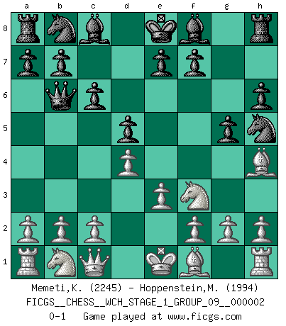 Last move : 0-1 2007 February 25 5:46:31 [Event "FICGS__CHESS__WCH_STAGE_1_GROUP_09__000002"] [Site "FICGS"] [Date "2007.01.16"] [Round "1"] [White "Memeti,Kastriot"] [Black "Hoppenstein,Michael"] [Result "0-1"] [WhiteElo "2245"] [BlackElo "1994"] 1.d4 d5 2.Nf3 c6 3.Bf4 Qb6 4.Qc1 Nf6 5.e3 Nh5 6.Bg5 h6 7.Bh4 g5 0-1 This chess game has been lost on time (started : 2007.01.16 15:20:23) Queen's pawn game Player Black won this chess game. Follow this game move after move (download)Nowadays, when you're not a grandmaster at 14, you can forget about it. (Anand Viswanathan) Wenn Spassky eine Figur opfert kannst du genauso gut aufgeben. Aber wenn Tal eine Figur opfert, spiel weiter. Er könnte noch eine weitere opfern, und dann ... wer weiß? (Miguel Najdorf) Aquel que toma al Peón de Caballo de la Reina, se pasará la noche a dormir en la calle. (Anónimo) Les Cavaliers se révèlent fort utiles dans les positions fermées. D'habitude, les Fous sont un peu plus forts que les Cavaliers dans les positions ouvertes. Qu'on le veuille ou non, il restera toujours des exceptions ! A good book on your shelf is a friend that turns its back on you and remains a friend. (Author unknown)