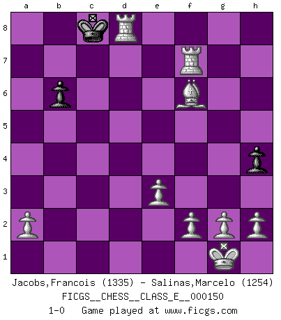 Last move : 1-0 2012 November 24 20:2:58 [Event "FICGS__CHESS__CLASS_E__000150"] [Site "FICGS"] [Date "2012.04.06"] [Round "1"] [White "Jacobs,Francois"] [Black "Salinas,Marcelo"] [Result "1-0"] [WhiteElo "1335"] [BlackElo "1254"] 1.d4 Nf6 2.Nf3 c6 3.e3 Ne4 4.Bd3 Qa5+ 5.Nbd2 Nxd2 6.Bxd2 Qb6 7.Bc3 e6 8.O-O d5 9.b3 Bb4 10.Bb2 c5 11.c3 c4 12.bxc4 Ba5 13.Rb1 dxc4 14.Bxc4 Qd6 15.Qa4+ Nc6 16.Ba3 Qc7 17.Ne5 Bd7 18.Nxd7 Kxd7 19.d5 exd5 20.Rfd1 Rad8 21.Rxd5+ Kc8 22.Rf5 Ne5 23.Rf4 Bxc3 24.Qxa7 Rd7 25.Bb5 Qb8 26.Bxd7+ Nxd7 27.Rc4+ Kd8 28.Qxb8+ Nxb8 29.Rd1+ Nd7 30.Rxc3 b6 31.Rcd3 Kc8 32.Rxd7 Rf8 33.Bxf8 Kb8 34.Rxf7 Kc8 35.Bxg7 h5 36.Bf6 h4 37.Rd8+ 1-0 Queen's pawn game Kingside Castling by player White (move 8) Player White won this chess game. Follow this game move after move (download)Examine moves that smite! A good eye for smites is far more important than a knowledge of strategical principles. (Purdy) Ich organisiere ein großes Turnier, was mich etwa 120000 Dollar kostet. Ich denke, das ist das erste Mal in der Schachgeschichte, daß ein Schachgroßmeister auch als Mäzen auftritt. (Miguel Najdorf) Una compensación adecuada por un sacrificio es tener una combinación sólida que conduce a una posición ganadora; una compensación adecuada por una metida de pata es dejar a tu oponente arrebatar una derrota de las fauces de la victoria. (Bruce A. Moon) J'ai toujours senti une vague pitié pour l'homme qui ne connaît rien aux échecs, tout comme j'en aurais pour un homme ignorant de l'amour. Les Echecs, comme la musique ou comme l'amour, ont le pouvoir de rendre heureux. (Siegbert Tarrasch) The leaves of memory seemed to make a mournful rustling in the dark. (Henry Wadsworth Longfellow)