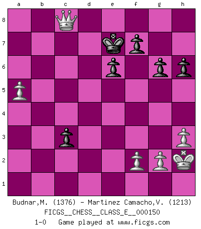 Last move : 1-0 2012 September 1 21:1:59 [Event "FICGS__CHESS__CLASS_E__000150"] [Site "FICGS"] [Date "2012.04.06"] [Round "1"] [White "Budnar,Milos"] [Black "Martinez Camacho,Victor Hugo"] [Result "1-0"] [WhiteElo "1376"] [BlackElo "1213"] 1.e4 c6 2.Nf3 d5 3.Nc3 dxe4 4.Nxe4 Bf5 5.Bd3 Bg6 6.O-O e6 7.Qe2 Be7 8.Ng3 Bxd3 9.cxd3 Nf6 10.d4 O-O 11.h3 Nbd7 12.d3 Nb6 13.Bg5 Rc8 14.b3 Nfd5 15.Bxe7 Qxe7 16.Qd2 Rc7 17.a3 c5 18.Rfc1 cxd4 19.Rxc7 Nxc7 20.Nxd4 Rd8 21.Nde2 Nb5 22.a4 Nd4 23.Nxd4 Rxd4 24.a5 Nc8 25.Qc3 Rd8 26.b4 a6 27.Rd1 Na7 28.Rc1 Rc8 29.Qd2 Rd8 30.Rc4 Qd6 31.d4 Nb5 32.Ne2 h6 33.Qe3 Qd5 34.Qd3 g6 35.Nc3 Nxc3 36.Qxc3 Kg7 37.Kh2 Rd7 38.Rc7 Kh7 39.Rxd7 Qxd7 40.Qc5 Qd5 41.Qe7 Kg7 42.Qc5 Qxc5 43.dxc5 Kf6 44.b5 Ke7 45.c6 bxc6 46.bxa6 c5 47.a7 c4 48.a8=Q c3 49.Qc8 1-0 Caro-Kann defense Kingside Castling by player White (move 6) Kingside Castling by player Black (move 10) Promotion Queen by player White (move 48) Player White won this chess game. Follow this game move after move (download)The only thing Chess players have in common is Chess. (Lodewijk Prins) Garry Kasparov war erst in der Großmeister-Organisation GMA, dann in der Profischach-Vereinigung PCA, zum Schluss kehrte er wieder in den Schoß der FIDE zurück. Aber gut, manche Leute sind flexibel (Viswanathan Anand) Te sientas frente a un tablero y repentinamente tu corazón brinca. Tu mano tiembla al tomar una pieza y moverla. Pero lo que el Ajedrez te enseña es que tu debes permanecer ahí con calma y pensar de que si realmente es una buena idea o de que si hay otras ideas mejores. (Stanley Kubrick) Ce n'est pas pour s'amuser qu'il joue aux échecs : il célèbre un culte. (Vladimir Nabokov) Rules and bones are meant to be broken. (Anonymous)